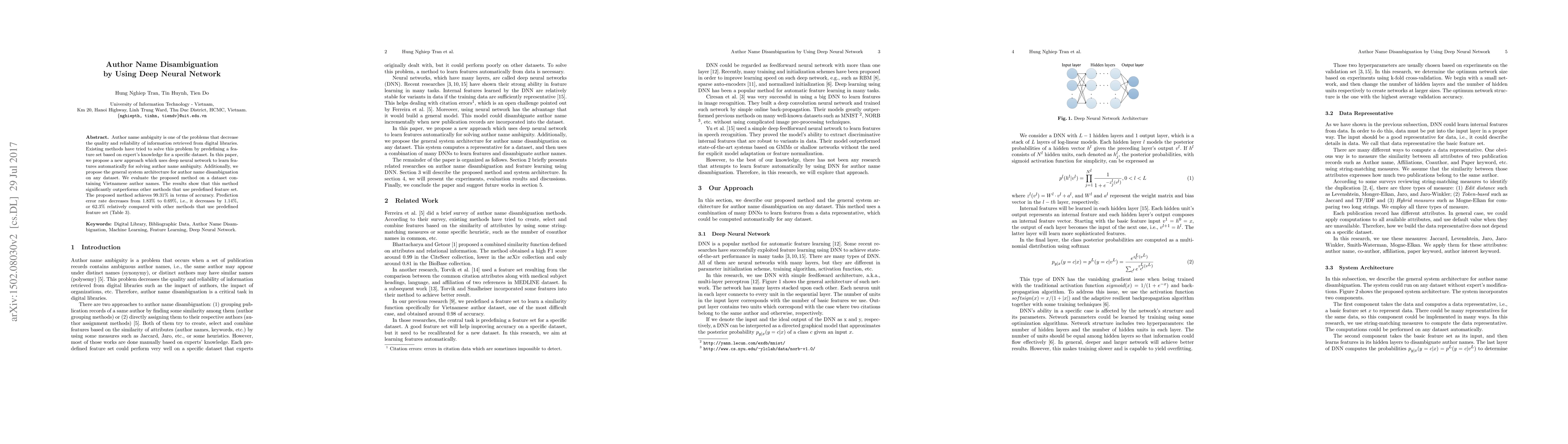 This paper proposes a deep neural network approach for disambiguating author names, automatically learning features from data instead of relying on predefined sets. The method achieves 99.31% accuracy, significantly outperforming existing methods, reducing the prediction error rate by 62.3% on a dataset of Vietnamese author names.