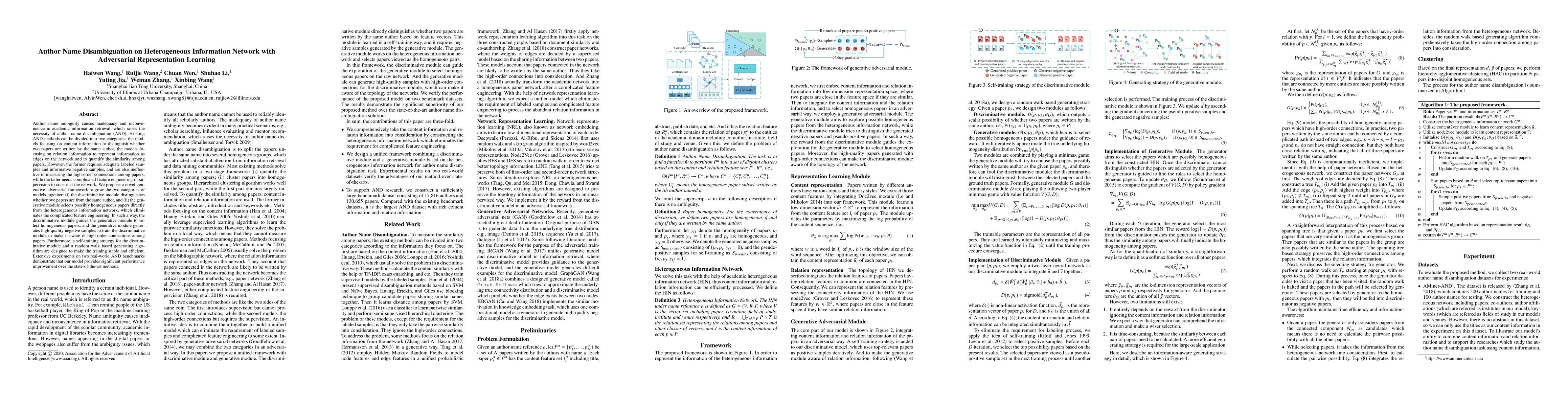 This paper proposes a generative adversarial framework for author name disambiguation (AND) on heterogeneous information networks, combining discriminative and generative modules to improve performance by eliminating complex feature engineering and leveraging high-order connections. Experimental results show significant improvements over existing methods.