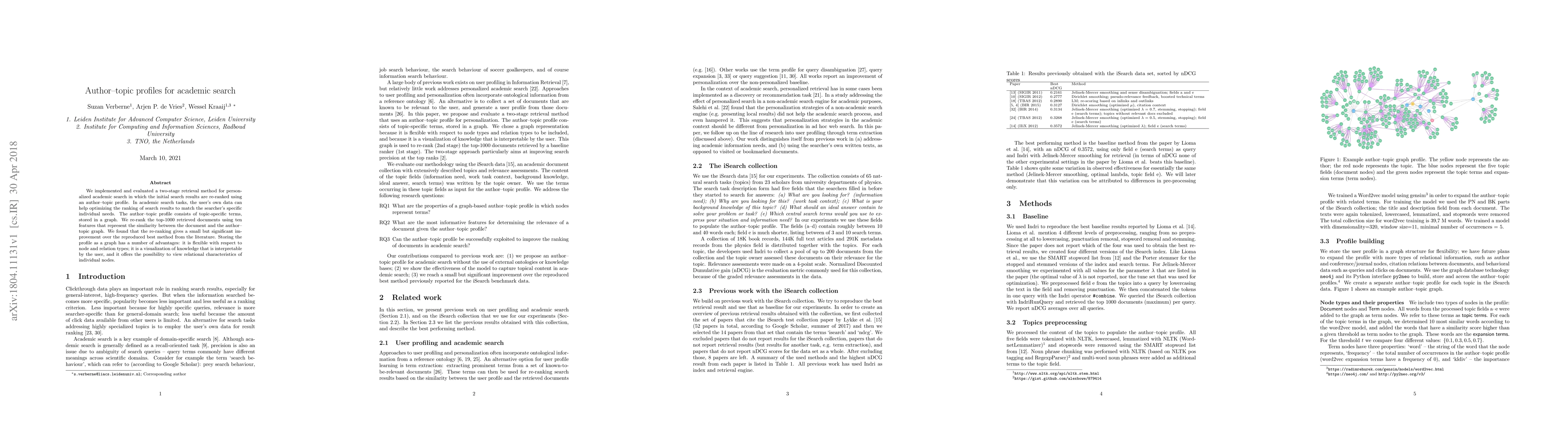 We implemented and evaluated a two-stage retrieval method for personalized academic search in which the initial search results are re-ranked using an author-topic profile. In academic search tasks, the user's own data can help optimizing the ranking of search results to match the searcher's specific individual needs. The author-topic profile consists of topic-specific terms, stored in a graph. We re-rank the top-1000 retrieved documents using ten features that represent the similarity between the document and the author-topic graph. We found that the re-ranking gives a small but significant improvement over the reproduced best method from the literature. Storing the profile as a graph has a number of advantages: it is flexible with respect to node and relation types; it is a visualization of knowledge that is interpretable by the user, and it offers the possibility to view relational characteristics of individual nodes.