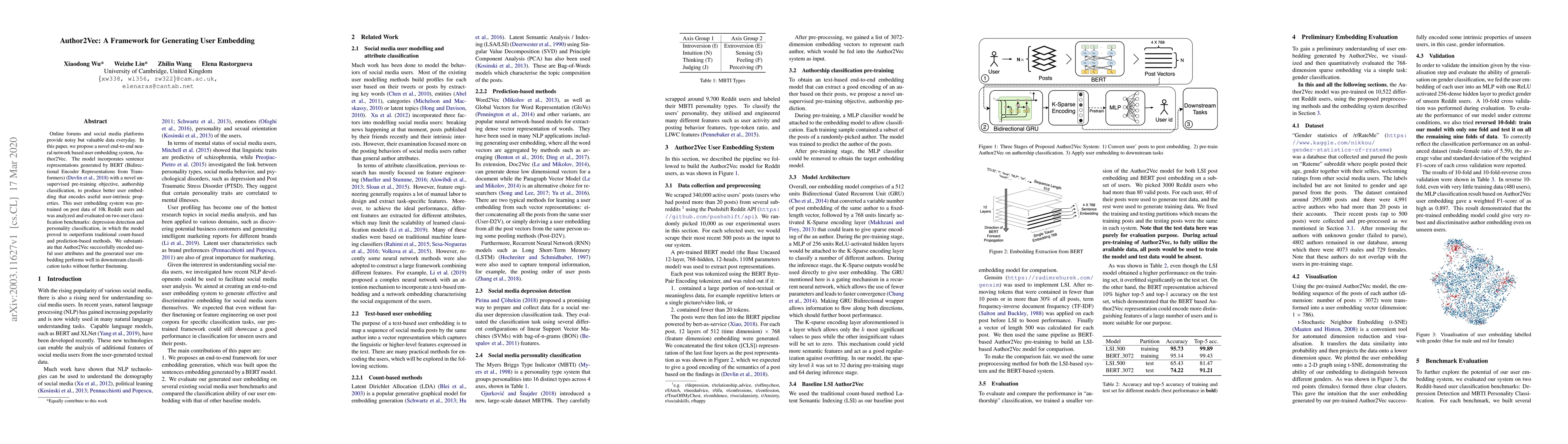 Author2Vec is a neural network-based user embedding system that combines BERT sentence representations with an unsupervised pre-training objective for authorship classification. It outperforms traditional methods in depression detection and personality classification tasks, demonstrating effective encoding of user-intrinsic properties.