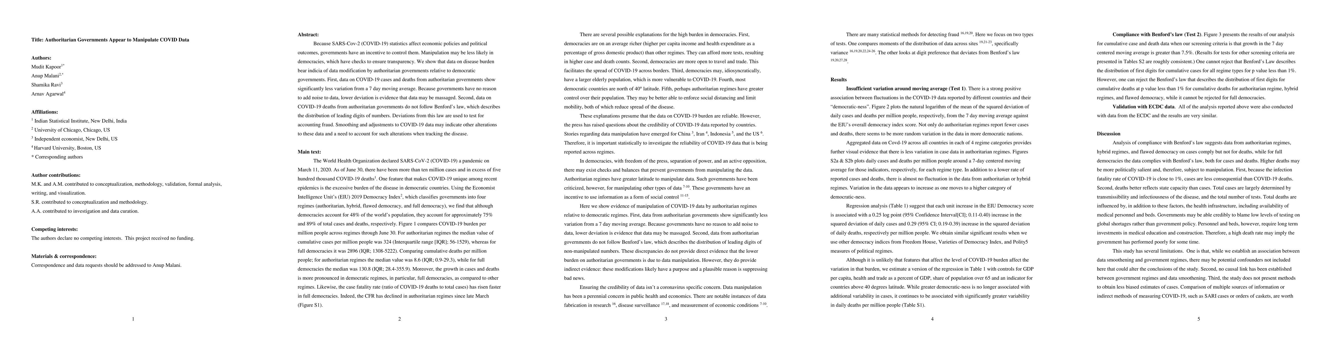 This paper demonstrates that authoritarian governments are more likely to manipulate COVID-19 data compared to democracies, evidenced by less variation in reported cases and deaths from a moving average, and deviations from Benford's law, suggesting potential data tampering.