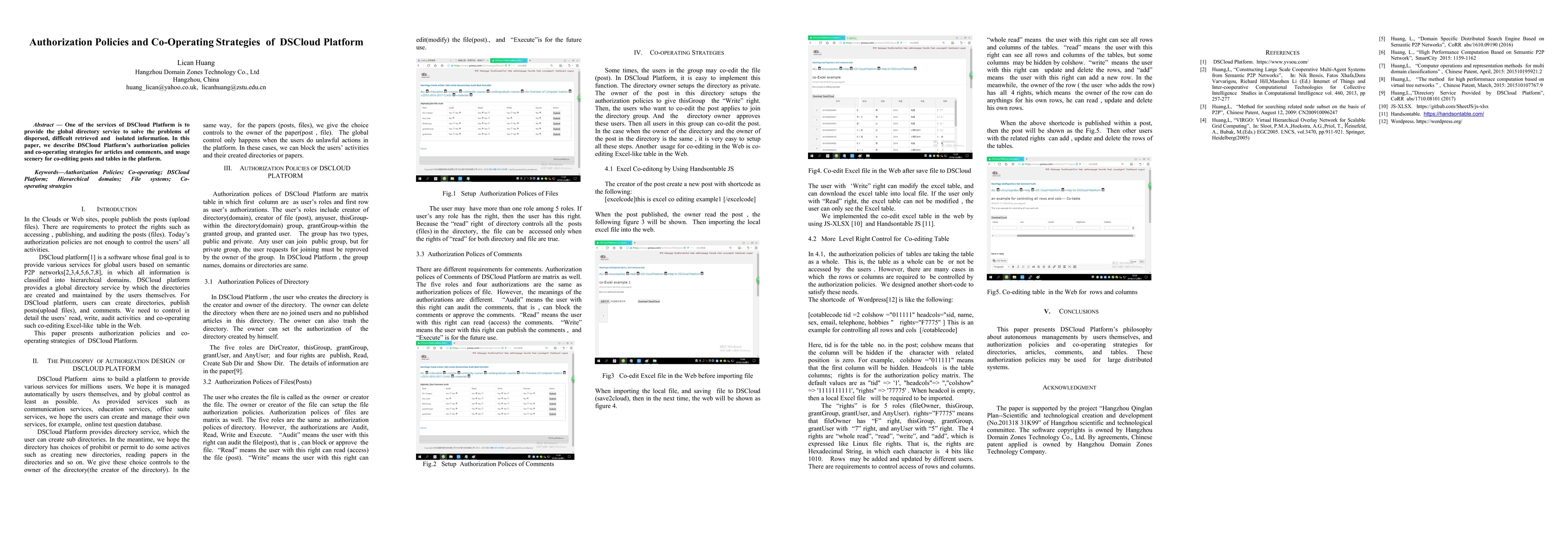 This paper outlines the authorization policies and co-operating strategies of the DSCloud Platform, focusing on its global directory service to address dispersed information retrieval issues, and details usage scenarios for co-editing posts and tables.