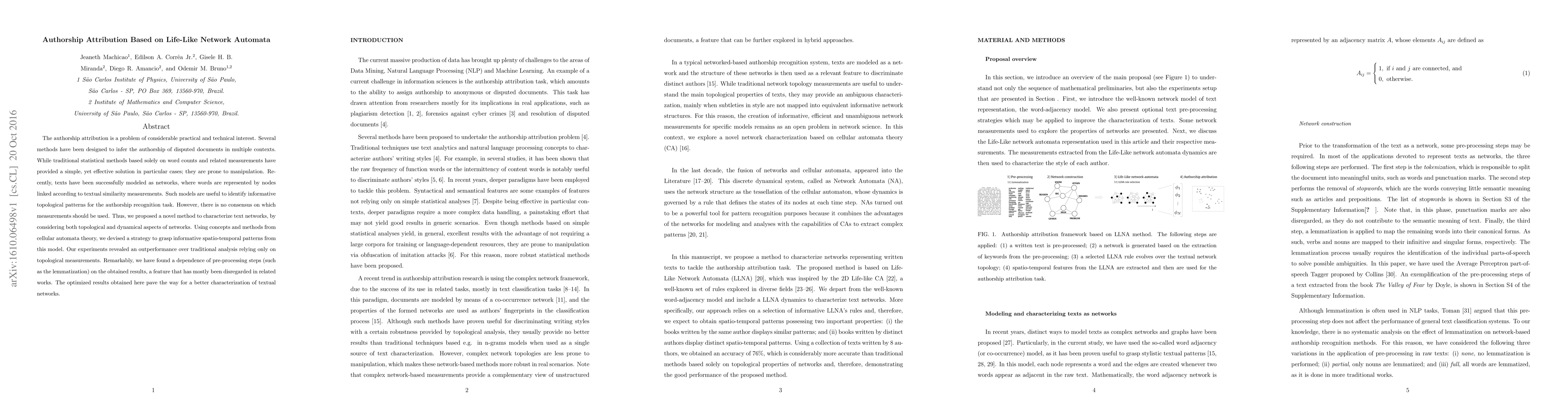 The authorship attribution is a problem of considerable practical and technical interest. Several methods have been designed to infer the authorship of disputed documents in multiple contexts. While traditional statistical methods based solely on word counts and related measurements have provided a simple, yet effective solution in particular cases; they are prone to manipulation. Recently, texts have been successfully modeled as networks, where words are represented by nodes linked according to textual similarity measurements. Such models are useful to identify informative topological patterns for the authorship recognition task. However, there is no consensus on which measurements should be used. Thus, we proposed a novel method to characterize text networks, by considering both topological and dynamical aspects of networks. Using concepts and methods from cellular automata theory, we devised a strategy to grasp informative spatio-temporal patterns from this model. Our experiments revealed an outperformance over traditional analysis relying only on topological measurements. Remarkably, we have found a dependence of pre-processing steps (such as the lemmatization) on the obtained results, a feature that has mostly been disregarded in related works. The optimized results obtained here pave the way for a better characterization of textual networks.