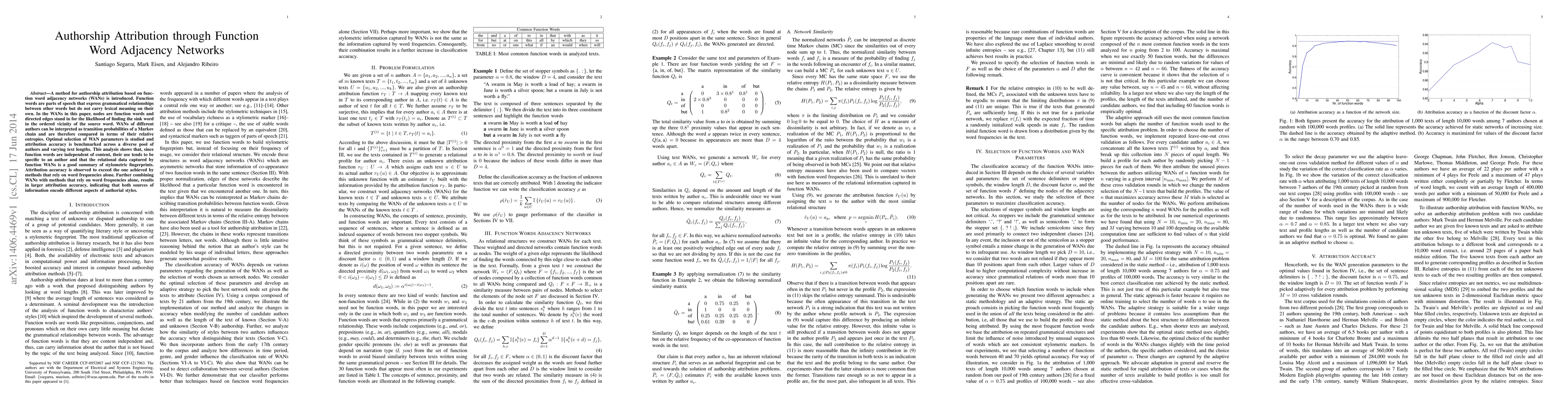 A method for authorship attribution based on function word adjacency networks (WANs) is introduced. Function words are parts of speech that express grammatical relationships between other words but do not carry lexical meaning on their own. In the WANs in this paper, nodes are function words and directed edges stand in for the likelihood of finding the sink word in the ordered vicinity of the source word. WANs of different authors can be interpreted as transition probabilities of a Markov chain and are therefore compared in terms of their relative entropies. Optimal selection of WAN parameters is studied and attribution accuracy is benchmarked across a diverse pool of authors and varying text lengths. This analysis shows that, since function words are independent of content, their use tends to be specific to an author and that the relational data captured by function WANs is a good summary of stylometric fingerprints. Attribution accuracy is observed to exceed the one achieved by methods that rely on word frequencies alone. Further combining WANs with methods that rely on word frequencies alone, results in larger attribution accuracy, indicating that both sources of information encode different aspects of authorial styles.