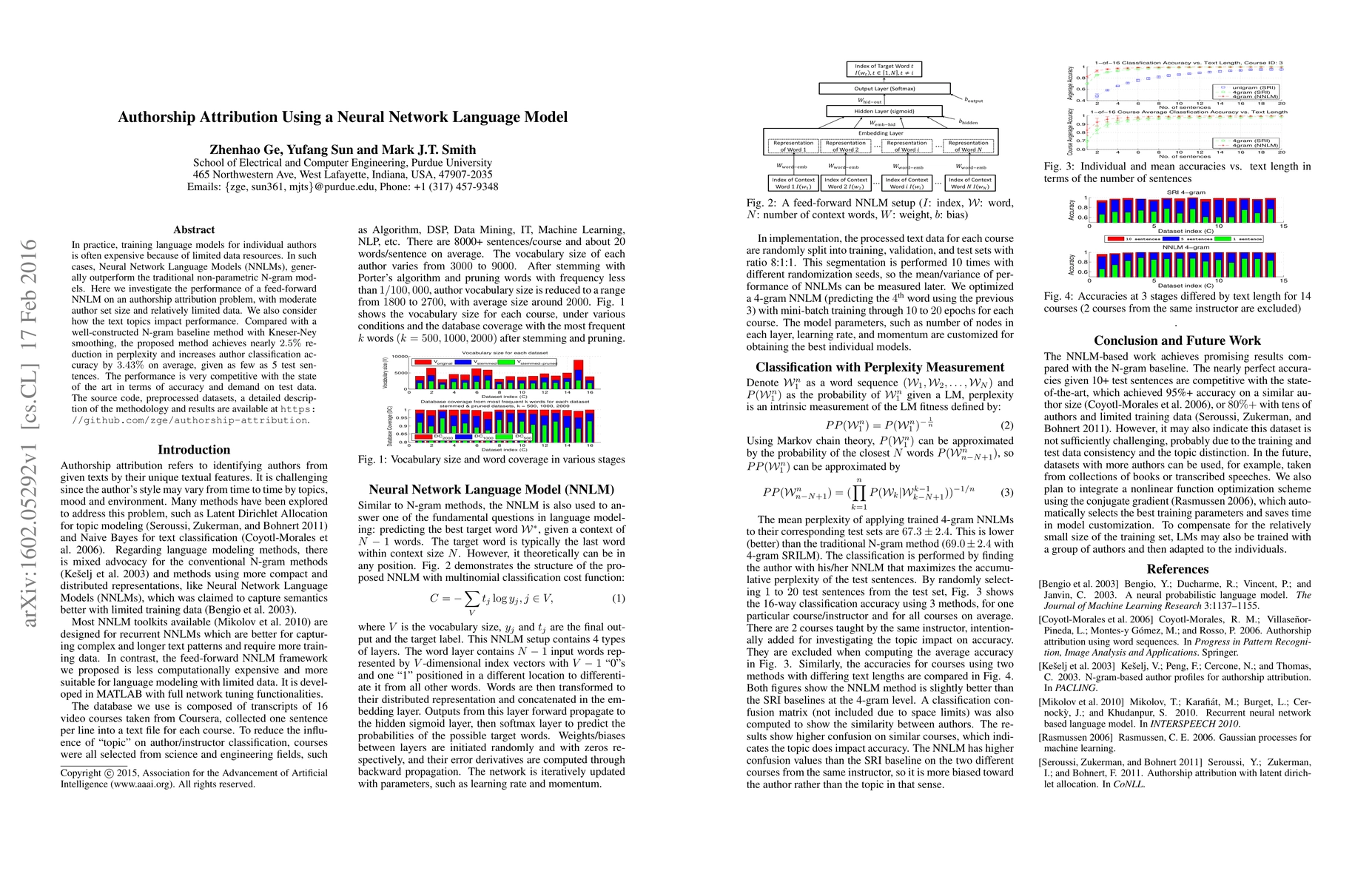 This paper explores the use of a feed-forward Neural Network Language Model (NNLM) for authorship attribution, achieving a 2.5% reduction in perplexity and a 3.43% increase in classification accuracy compared to an N-gram baseline, demonstrating competitive performance with minimal data. The source code and datasets are available for further exploration.