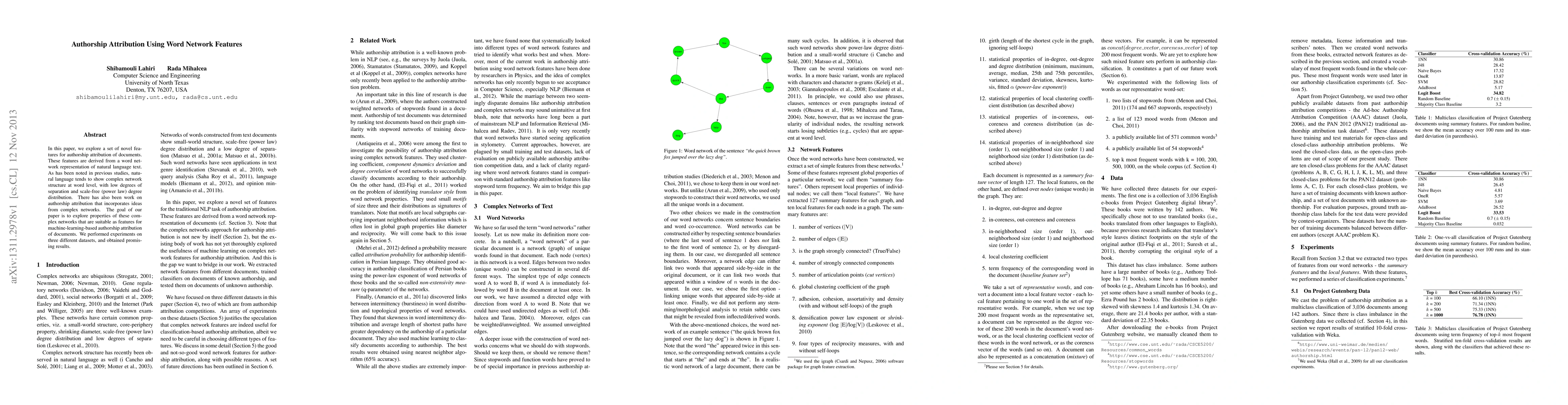 This paper introduces new features for authorship attribution derived from word network representations of text, leveraging complex network properties like low degrees of separation and scale-free degree distribution. Experiments on three datasets show promising results for machine-learning-based authorship attribution.