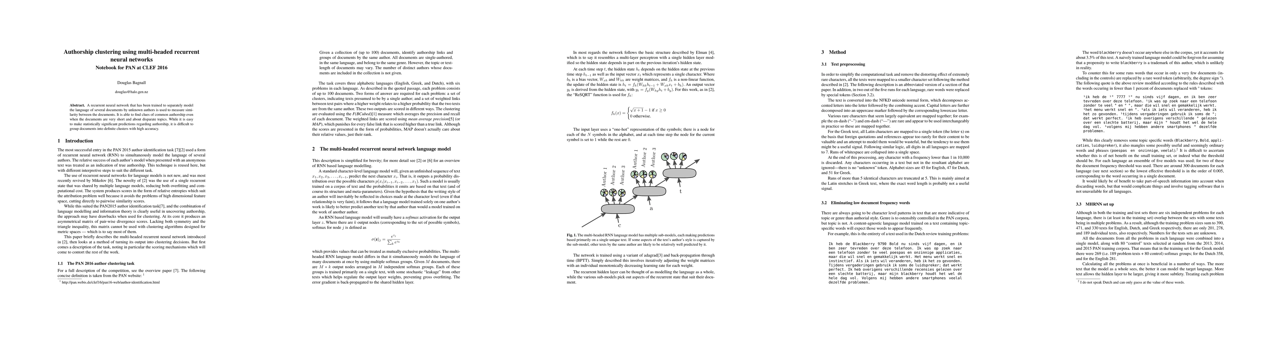 This paper proposes a multi-headed recurrent neural network to identify authorship by modeling the language of multiple documents, even when they are short and varied. Despite its ability to make statistically significant predictions, the method struggles to accurately cluster documents into distinct authorship groups.