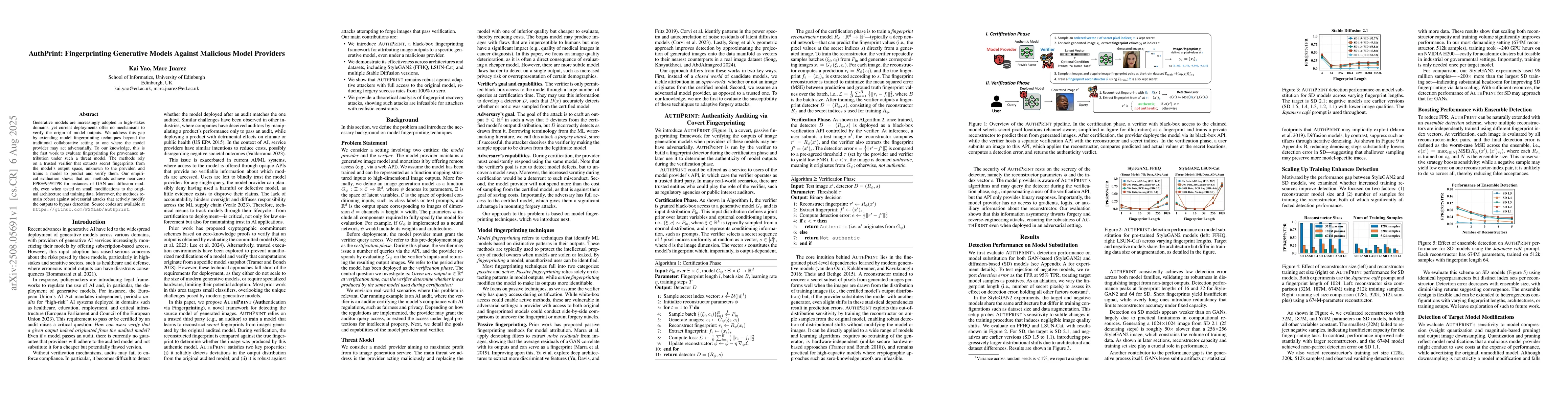 Generative models are increasingly adopted in high-stakes domains, yet current deployments offer no mechanisms to verify the origin of model outputs. We address this gap by extending model fingerprinting techniques beyond the traditional collaborative setting to one where the model provider may act adversarially. To our knowledge, this is the first work to evaluate fingerprinting for provenance attribution under such a threat model. The methods rely on a trusted verifier that extracts secret fingerprints from the model's output space, unknown to the provider, and trains a model to predict and verify them. Our empirical evaluation shows that our methods achieve near-zero FPR@95%TPR for instances of GAN and diffusion models, even when tested on small modifications to the original architecture and training data. Moreover, the methods remain robust against adversarial attacks that actively modify the outputs to bypass detection. Source codes are available at https://github.com/PSMLab/authprint.