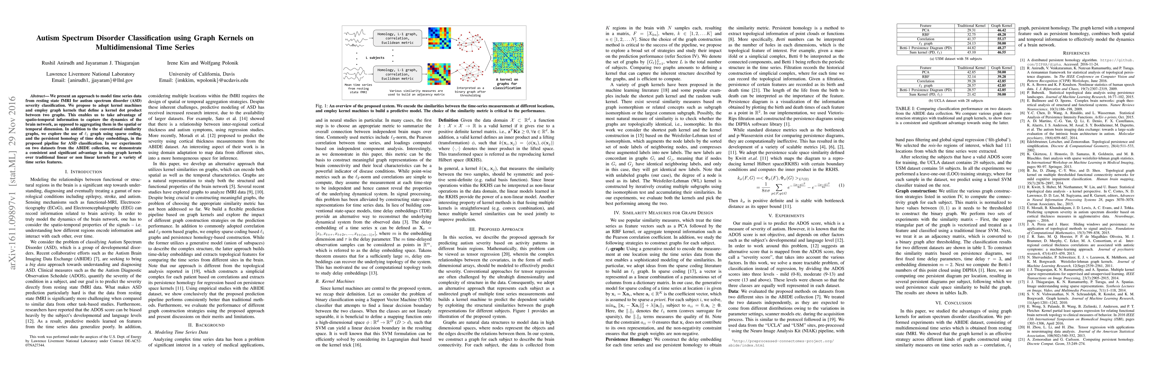 This paper proposes using graph kernels on multidimensional time series from resting state fMRI to classify autism spectrum disorder (ASD) severity, demonstrating superior performance over traditional kernels by capturing spatio-temporal brain network dynamics. Experiments on ABIDE datasets show consistent advantages with novel approaches like L1 graph and persistent homology.