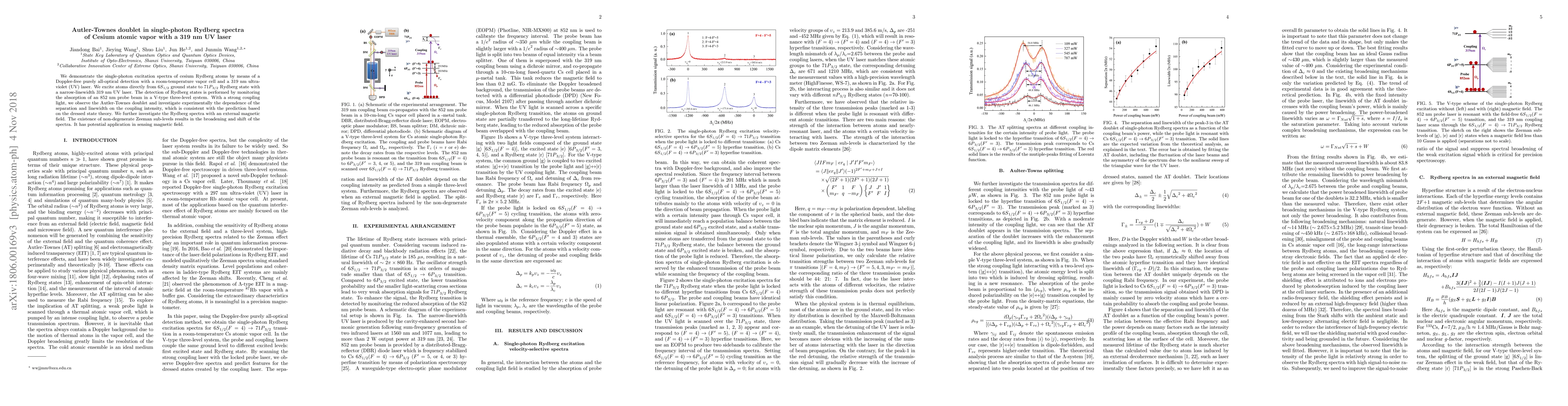 This study demonstrates single-photon excitation spectra of cesium Rydberg atoms using a 319 nm UV laser, observing an Autler-Townes doublet via a Doppler-free optical detection method. The Rydberg states' dependence on coupling intensity aligns with dressed state theory predictions, while magnetic field application causes spectral broadening and shifts, indicating potential for magnetic field sensing.