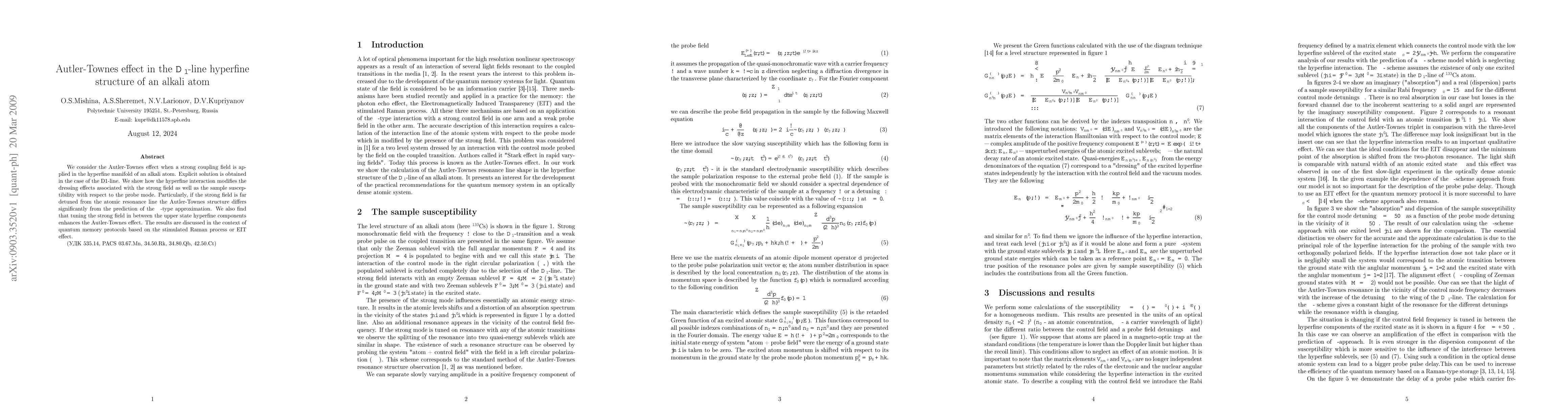 This paper investigates the Autler-Townes effect in the D1-line hyperfine structure of an alkali atom under a strong coupling field, revealing modifications to dressing effects and sample susceptibility. It finds that the effect significantly deviates from Lambda-type approximation predictions when the strong field is far detuned, and enhances when tuned between upper state hyperfine components, relevant for quantum memory protocols.