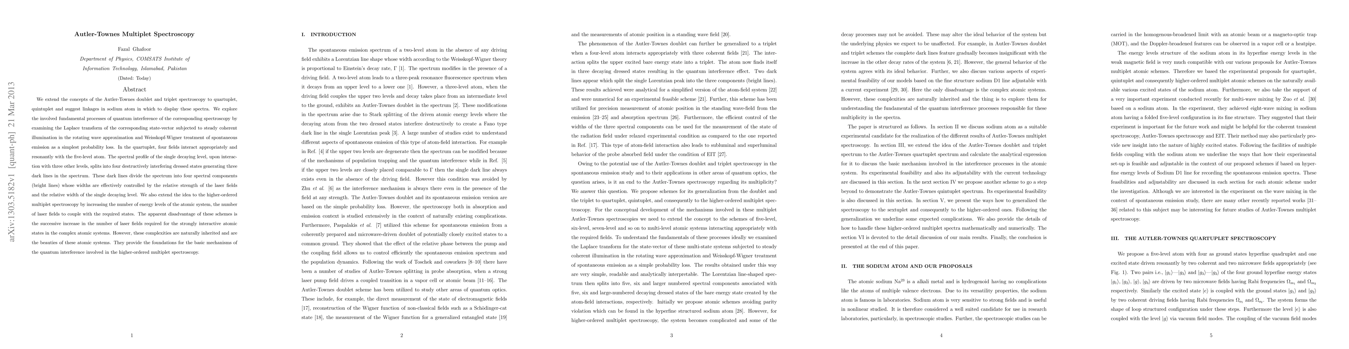 We extend the concepts of the Autler-Townes doublet and triplet spectroscopy to quartuplet, quintuplet and suggest linkages in sodium atom in which to display these spectra. We explore the involved fundamental processes of quantum interference of the corresponding spectroscopy by examining the Laplace transform of the corresponding state-vector subjected to steady coherent illumination in the rotating wave approximation and Weisskopf-Wigner treatment of spontaneous emission as a simplest probability loss. In the quartuplet, four fields interact appropriately and resonantly with the five-level atom. The spectral profile of the single decaying level, upon interaction with three other levels, splits into four destructively interfering dressed states generating three dark lines in the spectrum. These dark lines divide the spectrum into four spectral components (bright lines) whose widths are effectively controlled by the relative strength of the laser fields and the relative width of the single decaying level. We also extend the idea to the higher-ordered multiplet spectroscopy by increasing the number of energy levels of the atomic system, the number of laser fields to couple with the required states. The apparent disadvantage of these schemes is the successive increase in the number of laser fields required for the strongly interactive atomic states in the complex atomic systems. However, these complexities are naturally inherited and are the beauties of these atomic systems. They provide the foundations for the basic mechanisms of the quantum interference involved in the higher-ordered multiplet spectroscopy.