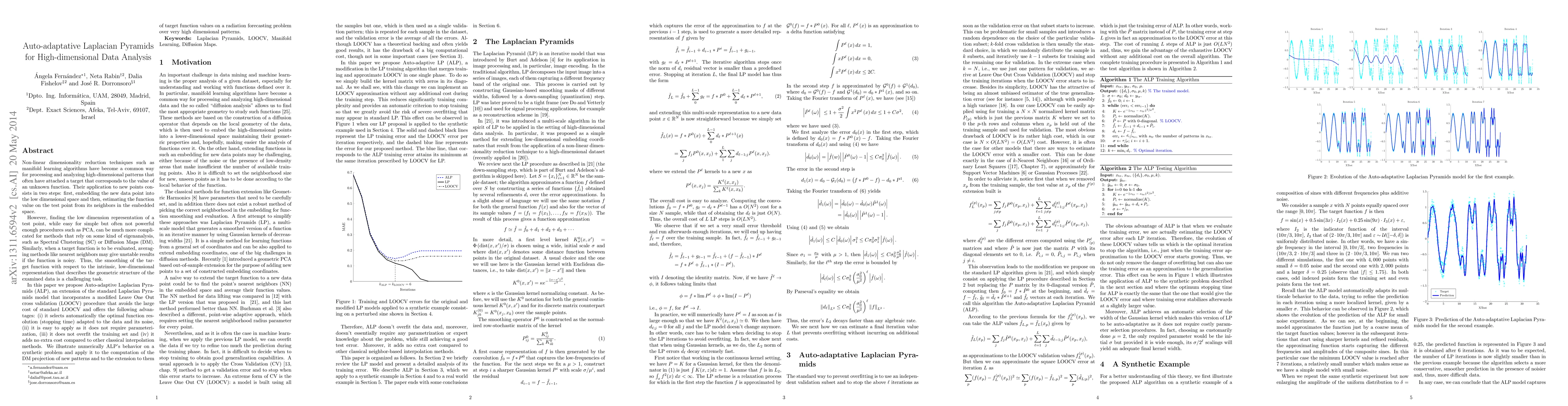Non-linear dimensionality reduction techniques such as manifold learning algorithms have become a common way for processing and analyzing high-dimensional patterns that often have attached a target that corresponds to the value of an unknown function. Their application to new points consists in two steps: first, embedding the new data point into the low dimensional space and then, estimating the function value on the test point from its neighbors in the embedded space. However, finding the low dimension representation of a test point, while easy for simple but often not powerful enough procedures such as PCA, can be much more complicated for methods that rely on some kind of eigenanalysis, such as Spectral Clustering (SC) or Diffusion Maps (DM). Similarly, when a target function is to be evaluated, averaging methods like nearest neighbors may give unstable results if the function is noisy. Thus, the smoothing of the target function with respect to the intrinsic, low-dimensional representation that describes the geometric structure of the examined data is a challenging task. In this paper we propose Auto-adaptive Laplacian Pyramids (ALP), an extension of the standard Laplacian Pyramids model that incorporates a modified LOOCV procedure that avoids the large cost of the standard one and offers the following advantages: (i) it selects automatically the optimal function resolution (stopping time) adapted to the data and its noise, (ii) it is easy to apply as it does not require parameterization, (iii) it does not overfit the training set and (iv) it adds no extra cost compared to other classical interpolation methods. We illustrate numerically ALP's behavior on a synthetic problem and apply it to the computation of the DM projection of new patterns and to the extension to them of target function values on a radiation forecasting problem over very high dimensional patterns.