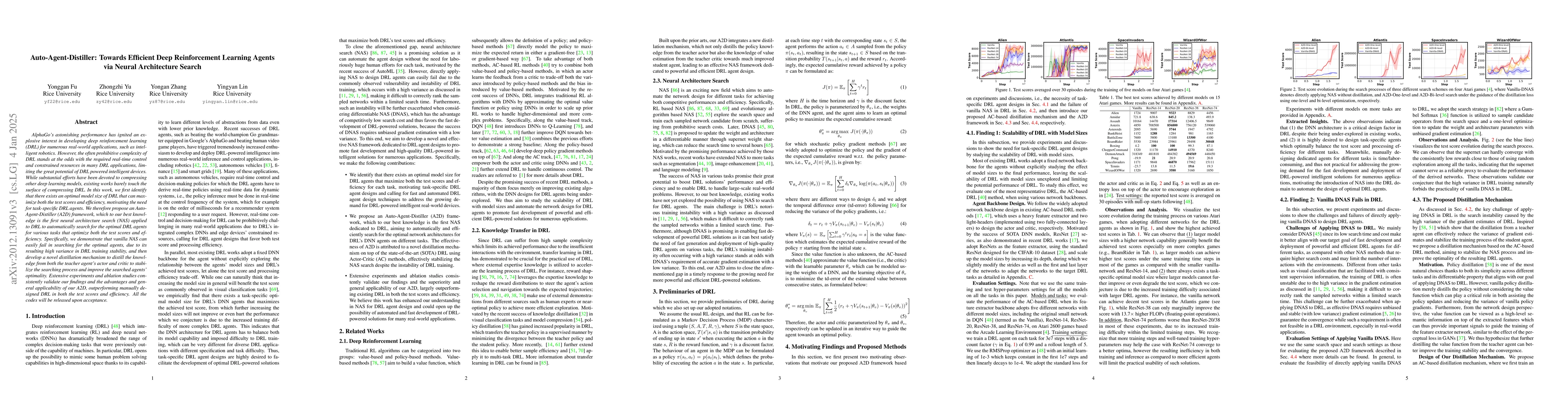 Researchers propose Auto-Agent-Distiller (A2D), a neural architecture search framework that optimizes both test scores and efficiency in deep reinforcement learning, outperforming manual designs in various tasks.