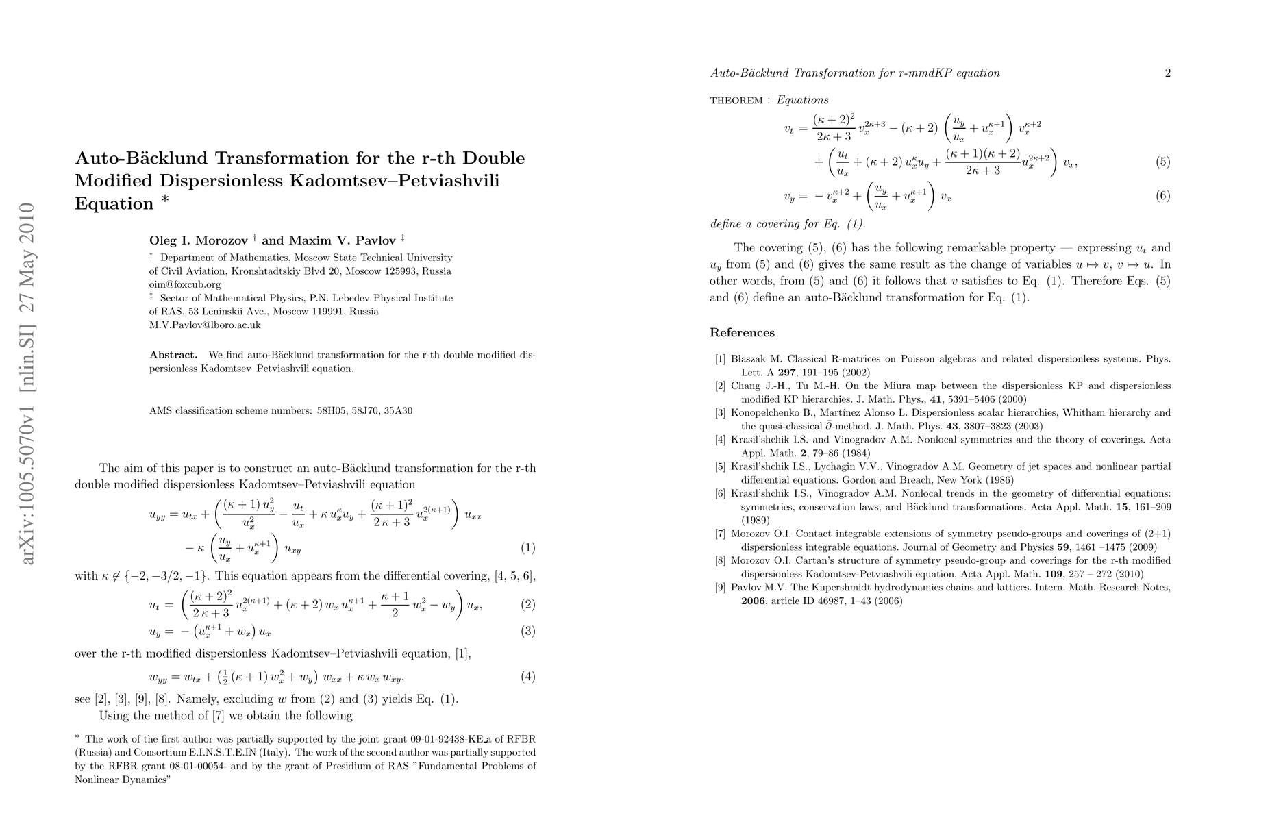 Summary: This paper presents the auto-Backlund transformation for the r-th double modified dispersionless Kadomtsev-Petviashvili equation, providing a method to understand its underlying structure and potential solutions.