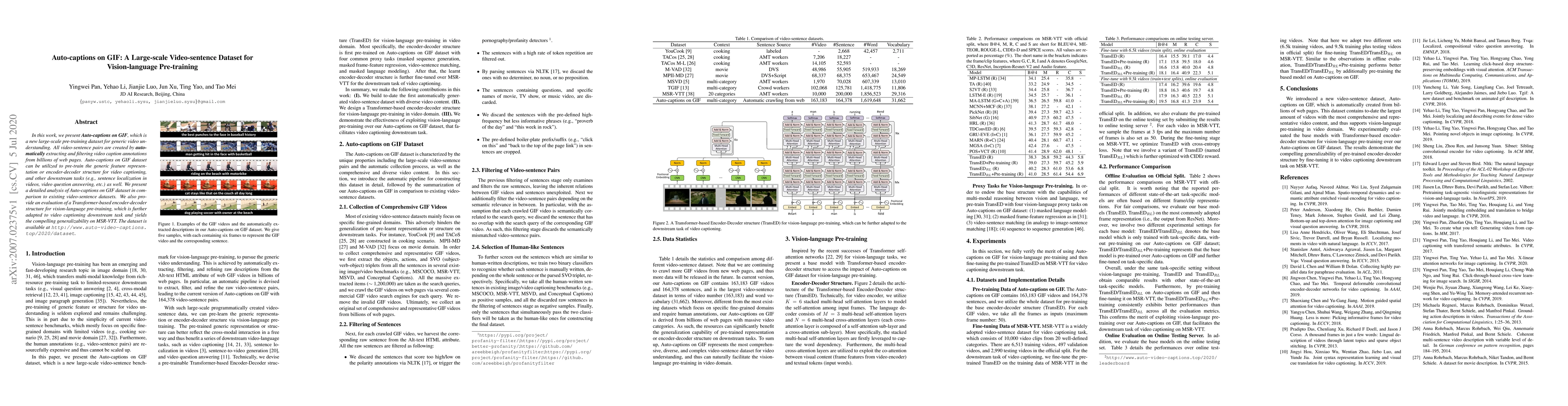 This paper introduces the Auto-captions on GIF dataset, a large-scale resource for vision-language pre-training, created by automatically extracting video-sentence pairs from web pages. The dataset is useful for training models for video captioning and other related tasks, and a Transformer-based encoder-decoder model is evaluated for its effectiveness.