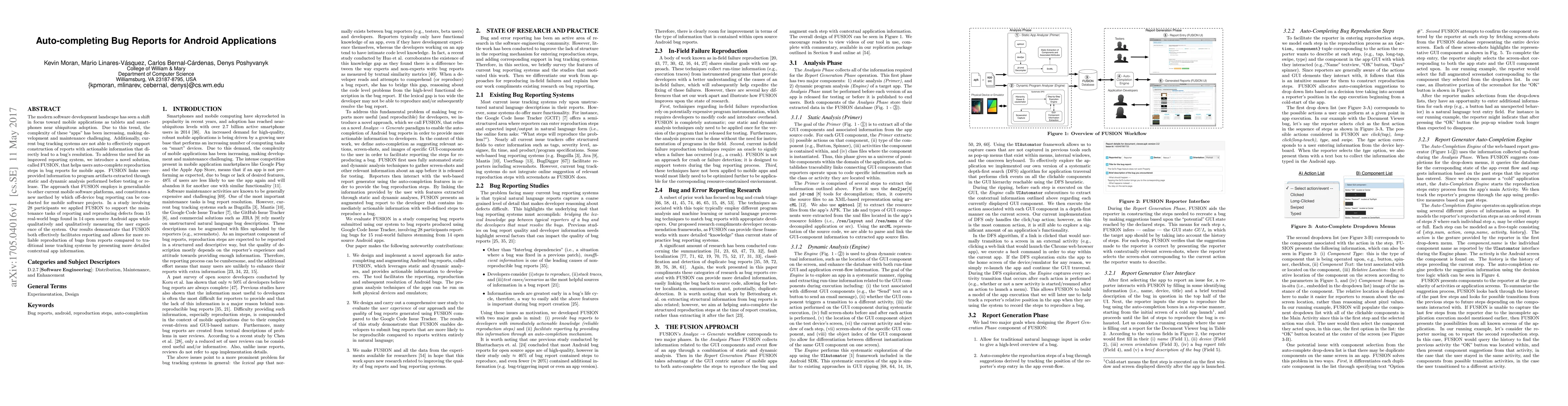 FUSION is a novel solution for auto-completing bug reports in Android applications by leveraging static and dynamic analysis to provide detailed contextual information. Results from a study with 28 participants show that FUSION enhances both bug reporting and reproduction accuracy compared to traditional systems.