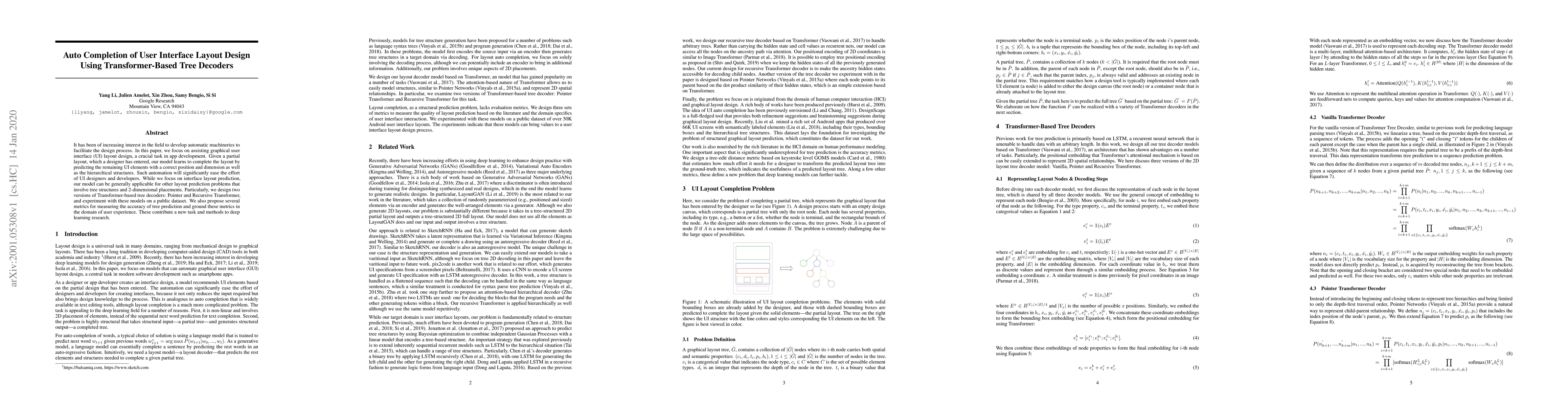 It has been of increasing interest in the field to develop automatic machineries to facilitate the design process. In this paper, we focus on assisting graphical user interface (UI) layout design, a crucial task in app development. Given a partial layout, which a designer has entered, our model learns to complete the layout by predicting the remaining UI elements with a correct position and dimension as well as the hierarchical structures. Such automation will significantly ease the effort of UI designers and developers. While we focus on interface layout prediction, our model can be generally applicable for other layout prediction problems that involve tree structures and 2-dimensional placements. Particularly, we design two versions of Transformer-based tree decoders: Pointer and Recursive Transformer, and experiment with these models on a public dataset. We also propose several metrics for measuring the accuracy of tree prediction and ground these metrics in the domain of user experience. These contribute a new task and methods to deep learning research.