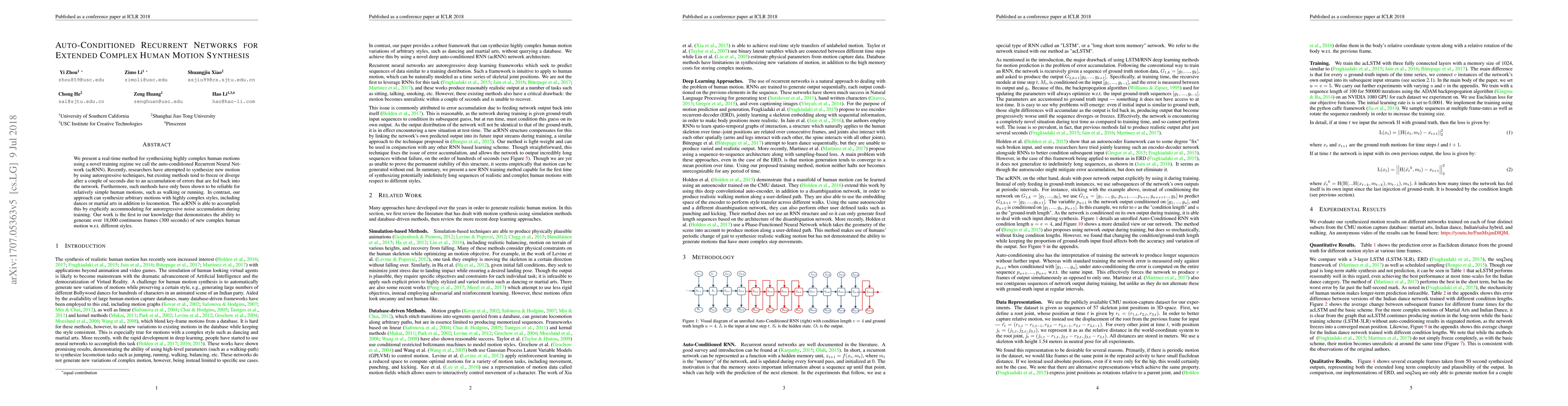 The research introduces an auto-conditioned Recurrent Neural Network (acRNN) for real-time synthesis of complex human motions, including dances and martial arts, over extended periods (300 seconds). This method addresses the issue of error accumulation in autoregressive techniques, enabling the generation of over 18,000 continuous frames of new, style-specific human motion.