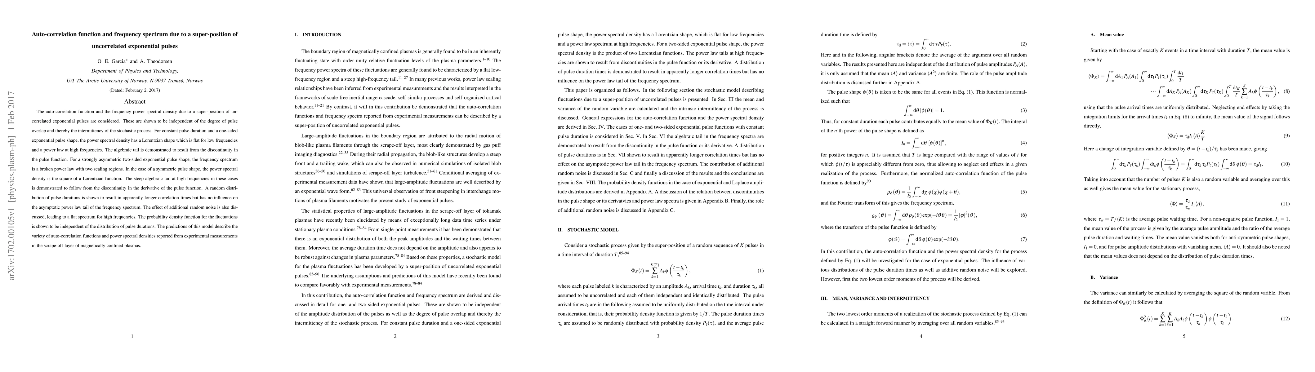 This paper investigates the auto-correlation function and frequency spectrum of a stochastic process composed of uncorrelated exponential pulses. It finds that the spectral density is independent of pulse overlap and exhibits distinct shapes based on pulse symmetry and duration, including Lorentzian and power-law distributions.
