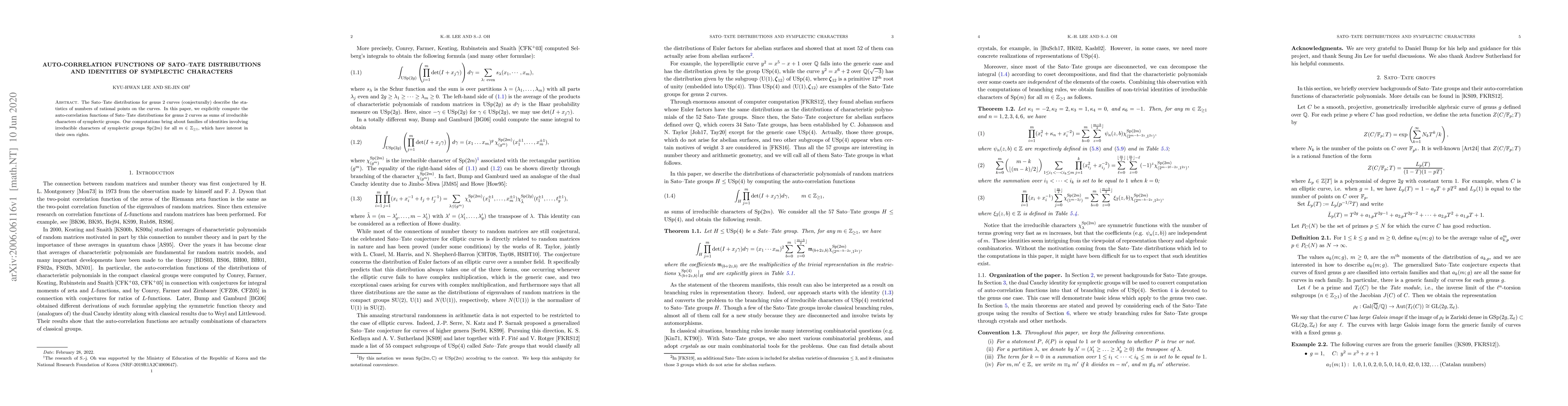 This paper computes the auto-correlation functions of Sato-Tate distributions for genus 2 curves, expressing them as sums of irreducible characters of symplectic groups. It also uncovers families of identities involving these characters, which are significant for their own mathematical value.