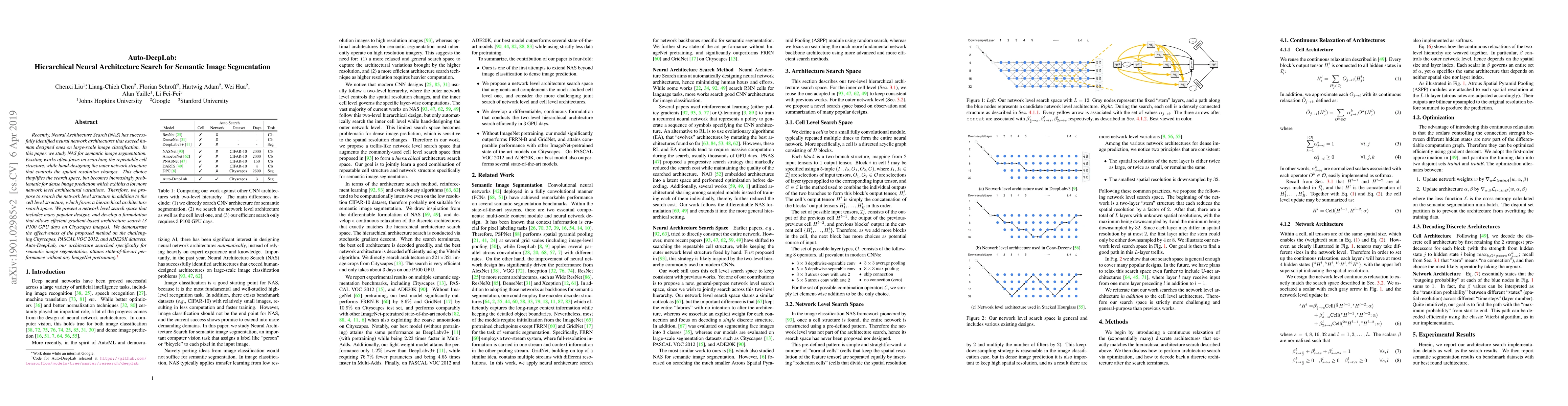 Auto-DeepLab employs hierarchical Neural Architecture Search for semantic image segmentation, focusing on both cell and network level structures to achieve superior performance on Cityscapes, PASCAL VOC 2012, and ADE20K datasets without ImageNet pretraining.