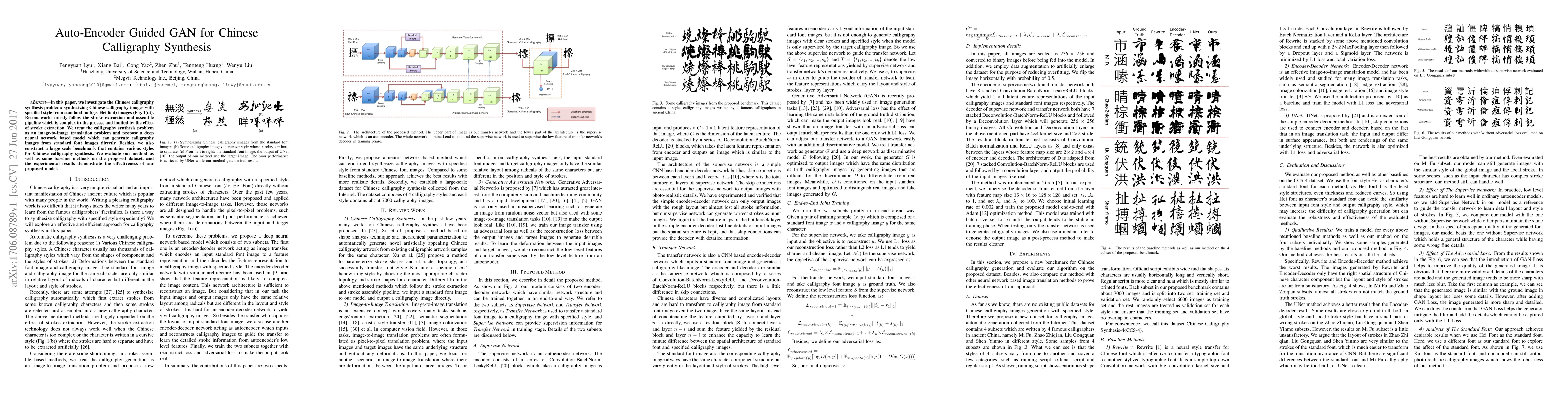This paper proposes a deep neural network model for synthesizing Chinese calligraphy images directly from standard font images, bypassing the complex stroke extraction process. The authors also create a large-scale benchmark dataset for evaluating their method, which outperforms baselines in generating stylistically accurate calligraphy.