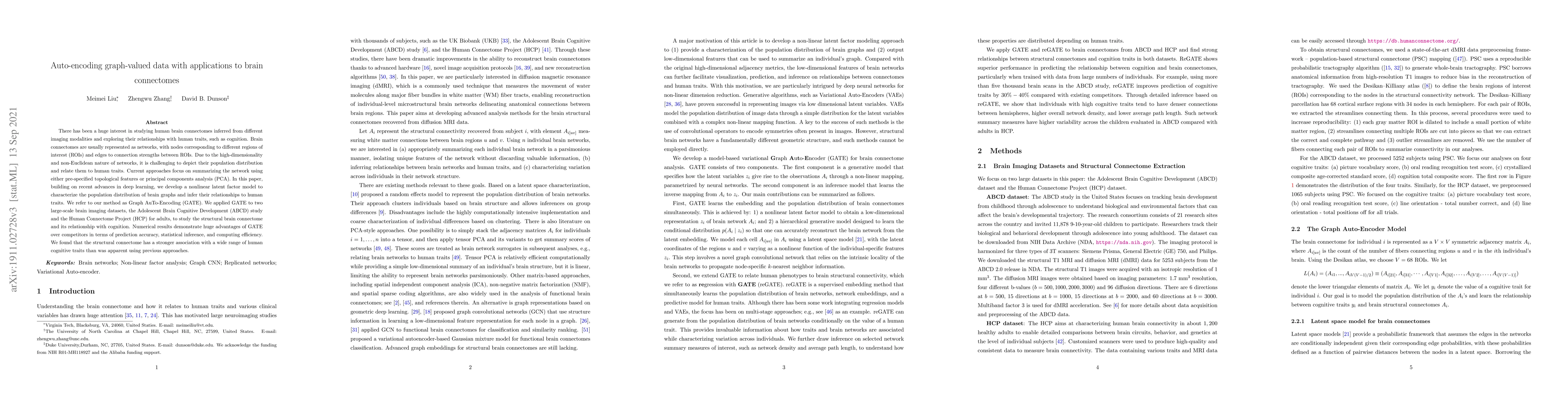 There has been huge interest in studying human brain connectomes inferred from different imaging modalities and exploring their relationship with human traits, such as cognition. Brain connectomes are usually represented as networks, with nodes corresponding to different regions of interest (ROIs) and edges to connection strengths between ROIs. Due to the high-dimensionality and non-Euclidean nature of networks, it is challenging to depict their population distribution and relate them to human traits. Current approaches focus on summarizing the network using either pre-specified topological features or principal components analysis (PCA). In this paper, building on recent advances in deep learning, we develop a nonlinear latent factor model to characterize the population distribution of brain graphs and infer the relationships between brain structural connectomes and human traits. We refer to our method as Graph AuTo-Encoding (GATE). We applied GATE to two large-scale brain imaging datasets, the Adolescent Brain Cognitive Development (ABCD) study and the Human Connectome Project (HCP) for adults, to understand the structural brain connectome and its relationship with cognition. Numerical results demonstrate huge advantages of GATE over competitors in terms of prediction accuracy, statistical inference and computing efficiency. We found that structural connectomes have a stronger association with a wide range of human cognitive traits than was apparent using previous approaches.