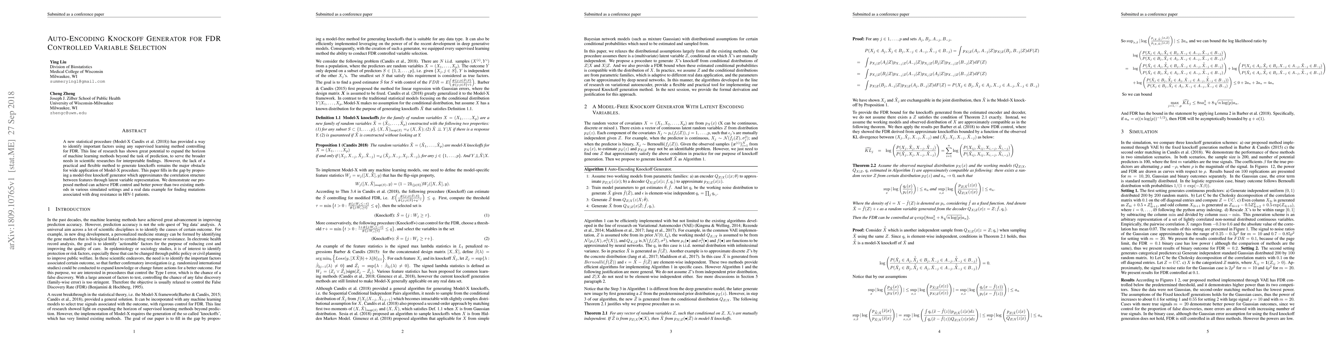 A new statistical procedure (Model-X \cite{candes2018}) has provided a way to identify important factors using any supervised learning method controlling for FDR. This line of research has shown great potential to expand the horizon of machine learning methods beyond the task of prediction, to serve the broader needs in scientific researches for interpretable findings. However, the lack of a practical and flexible method to generate knockoffs remains the major obstacle for wide application of Model-X procedure. This paper fills in the gap by proposing a model-free knockoff generator which approximates the correlation structure between features through latent variable representation. We demonstrate our proposed method can achieve FDR control and better power than two existing methods in various simulated settings and a real data example for finding mutations associated with drug resistance in HIV-1 patients.