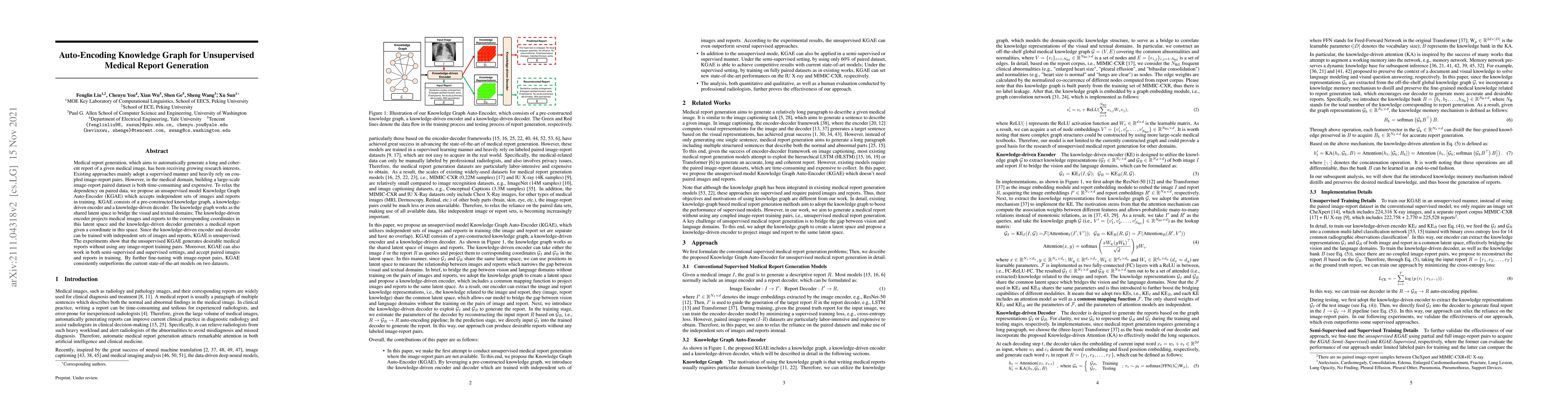 This paper proposes an unsupervised model called Knowledge Graph Auto-Encoder (KGAE) for generating medical reports without paired image-report training data. The model leverages a knowledge graph to bridge visual and textual domains, achieving effective report generation through knowledge-driven encoder and decoder.