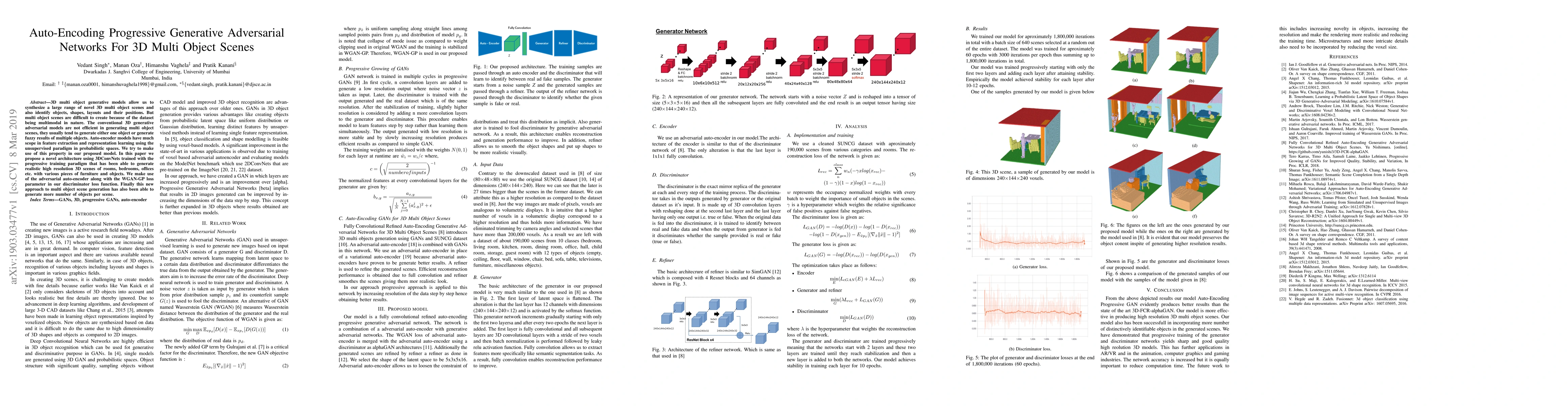 This paper proposes a novel auto-encoding progressive GAN architecture using 3DConvNets to generate realistic high-resolution 3D multi-object scenes, overcoming the limitations of conventional GANs in producing clear multi-object results. The model employs an adversarial auto-encoder with WGAN-GP loss for improved scene generation.
