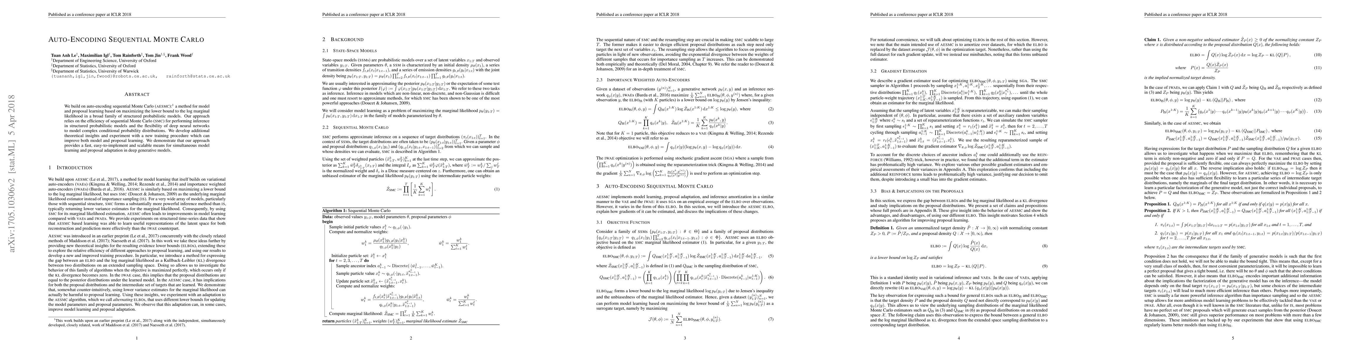 This paper introduces auto-encoding sequential Monte Carlo (AESMC), combining sequential Monte Carlo inference with deep neural networks for efficient model and proposal learning in structured probabilistic models. The new training procedure enhances both model and proposal adaptation, offering a scalable and easy-to-implement solution for deep generative models.