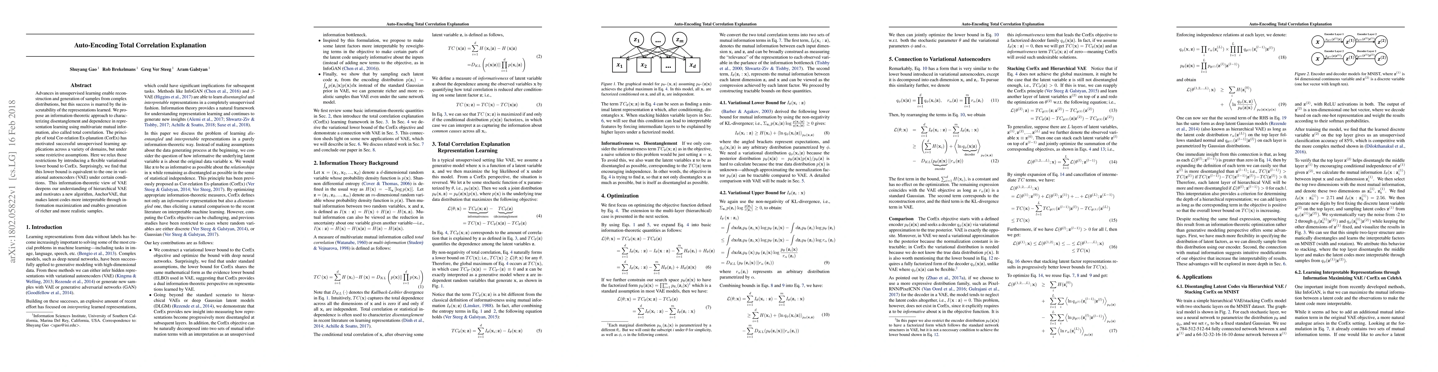 Advances in unsupervised learning enable reconstruction and generation of samples from complex distributions, but this success is marred by the inscrutability of the representations learned. We propose an information-theoretic approach to characterizing disentanglement and dependence in representation learning using multivariate mutual information, also called total correlation. The principle of total Cor-relation Ex-planation (CorEx) has motivated successful unsupervised learning applications across a variety of domains, but under some restrictive assumptions. Here we relax those restrictions by introducing a flexible variational lower bound to CorEx. Surprisingly, we find that this lower bound is equivalent to the one in variational autoencoders (VAE) under certain conditions. This information-theoretic view of VAE deepens our understanding of hierarchical VAE and motivates a new algorithm, AnchorVAE, that makes latent codes more interpretable through information maximization and enables generation of richer and more realistic samples.