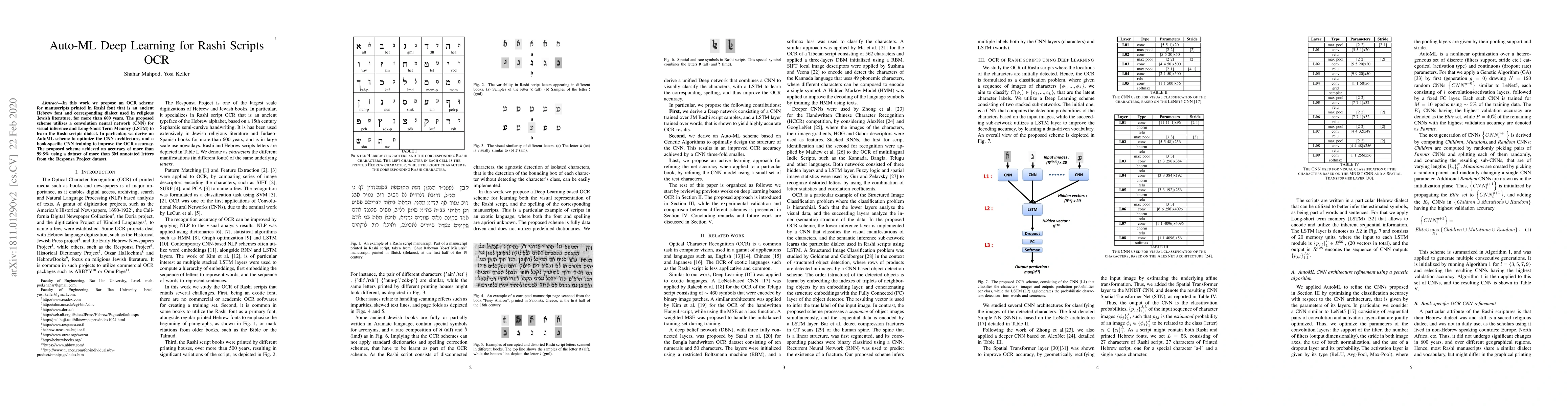 This research introduces an OCR (Optical Character Recognition) system for Rashi scripts, an ancient Hebrew font used in religious texts. The system uses a CNN for image analysis and LSTM for dialect learning, with an AutoML approach for optimizing CNN architecture. It achieved over 99.8% accuracy on a dataset of 3M annotated letters from the Responsa Project.