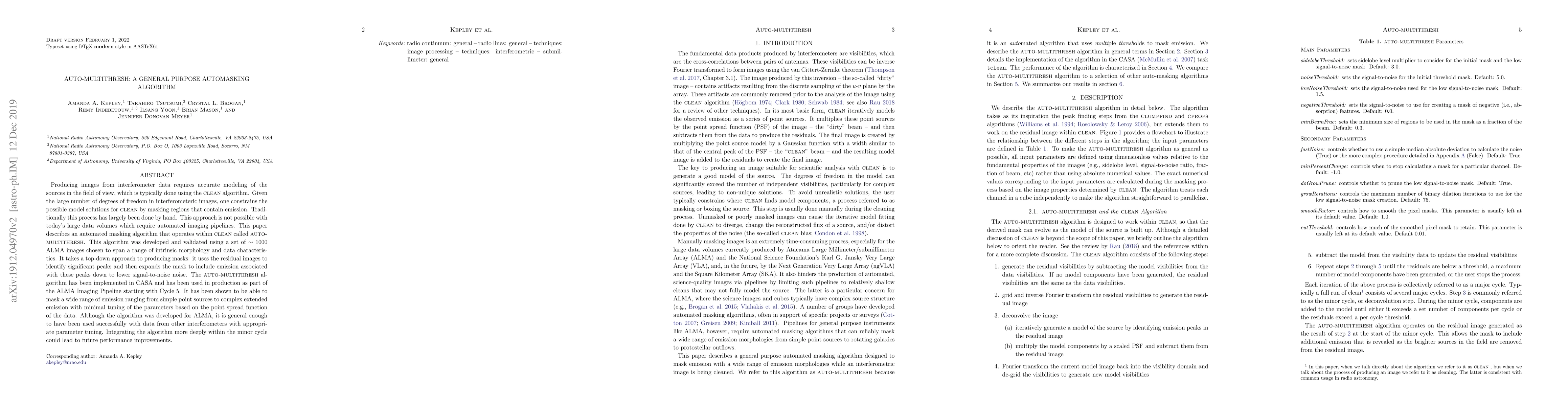 The AUTO-MULTITHRESH algorithm automates the masking process within the CLEAN algorithm for processing large interferometer data sets, significantly reducing manual effort. It has been validated on ~1000 ALMA images and implemented in CASA, showing effectiveness across a variety of emission types with minimal parameter adjustments.