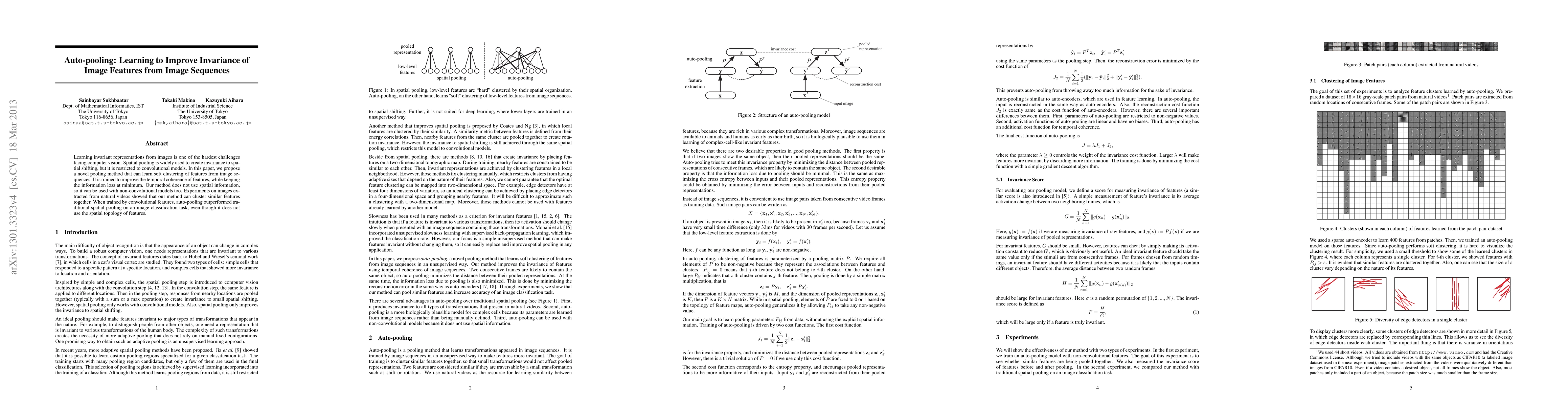 This paper introduces auto-pooling, a novel method for learning invariant image features from image sequences that clusters features based on temporal coherence. Unlike traditional spatial pooling, auto-pooling is applicable to non-convolutional models and outperformed spatial pooling in image classification tasks.