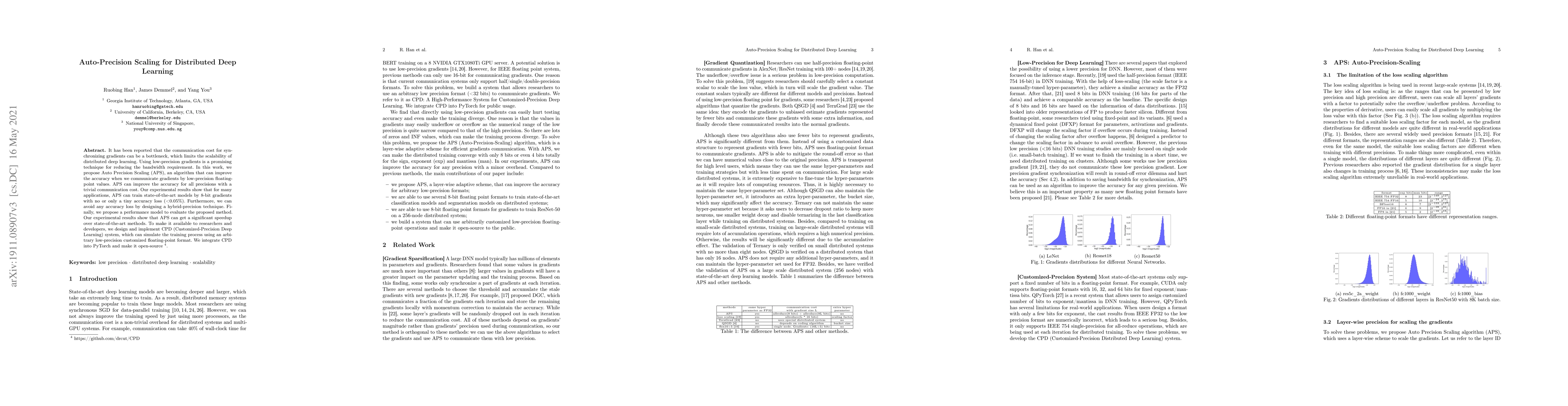 It has been reported that the communication cost for synchronizing gradients can be a bottleneck, which limits the scalability of distributed deep learning. Using low-precision gradients is a promising technique for reducing the bandwidth requirement. In this work, we propose Auto Precision Scaling (APS), an algorithm that can improve the accuracy when we communicate gradients by low-precision floating-point values. APS can improve the accuracy for all precisions with a trivial communication cost. Our experimental results show that for many applications, APS can train state-of-the-art models by 8-bit gradients with no or only a tiny accuracy loss (<0.05%). Furthermore, we can avoid any accuracy loss by designing a hybrid-precision technique. Finally, we propose a performance model to evaluate the proposed method. Our experimental results show that APS can get a significant speedup over state-of-the-art methods. To make it available to researchers and developers, we design and implement CPD (Customized-Precision Deep Learning) system, which can simulate the training process using an arbitrary low-precision customized floating-point format. We integrate CPD into PyTorch and make it open-source.