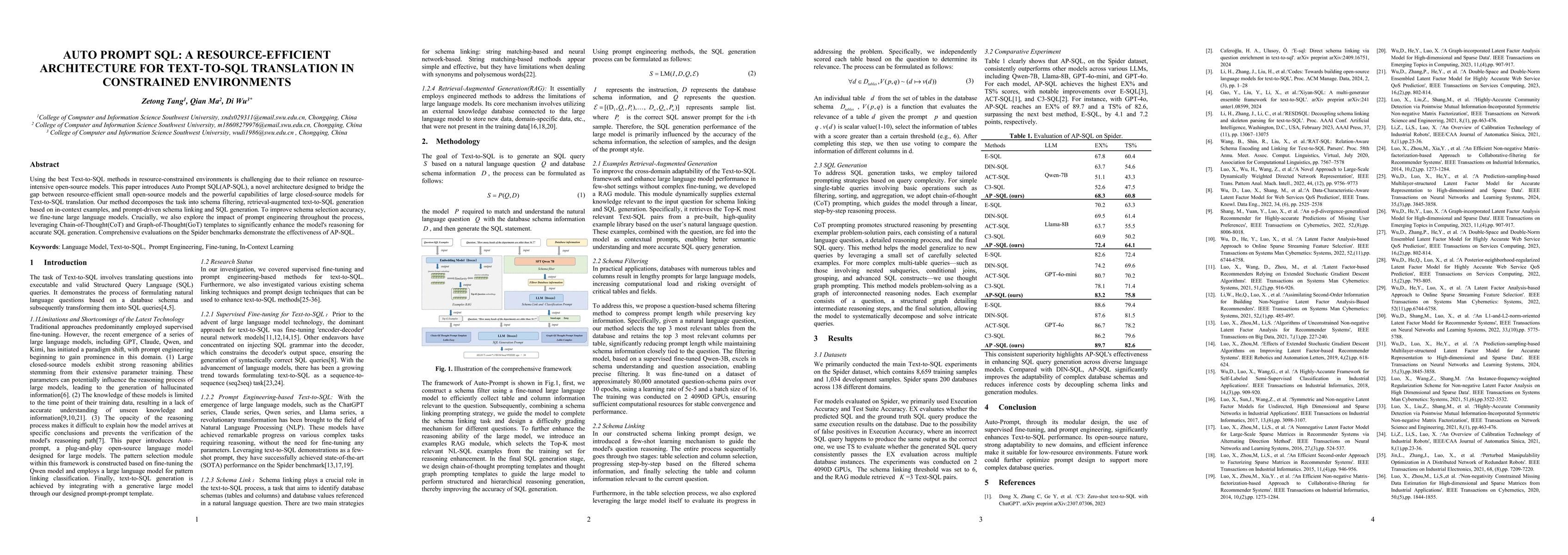 The research introduces Auto Prompt SQL (AP-SQL), a resource-efficient architecture for text-to-SQL translation. AP-SQL decomposes the task into schema filtering, retrieval-augmented text-to-SQL generation using in-context examples, and prompt-driven schema linking and SQL generation. Large language models are fine-tuned for improved schema selection accuracy, and Chain-of-Thought (CoT) and Graph-of-Thought (GoT) templates are employed to enhance reasoning for accurate SQL generation.
