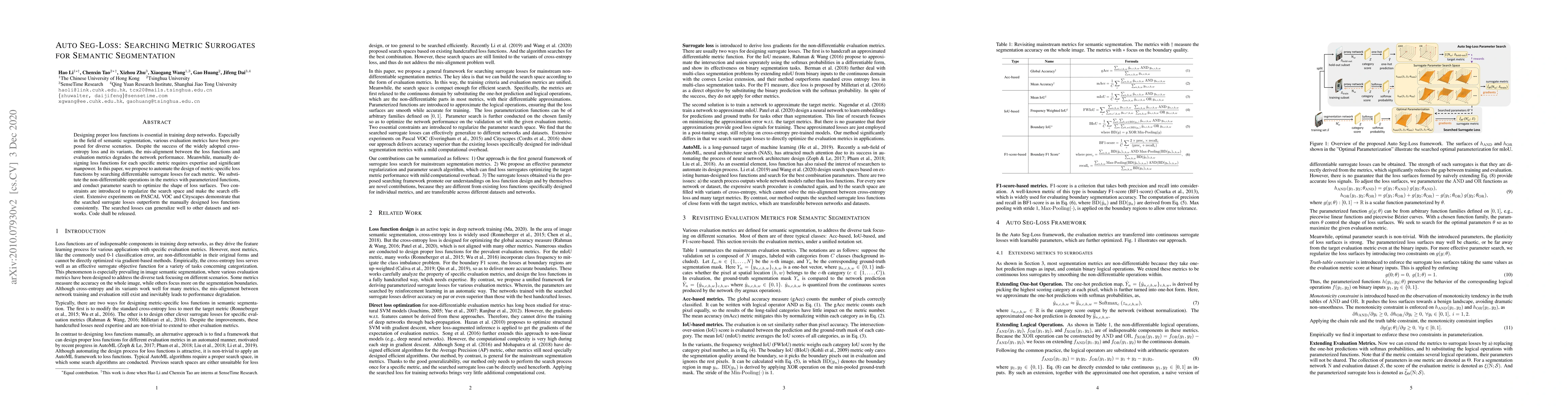 Designing proper loss functions is essential in training deep networks. Especially in the field of semantic segmentation, various evaluation metrics have been proposed for diverse scenarios. Despite the success of the widely adopted cross-entropy loss and its variants, the mis-alignment between the loss functions and evaluation metrics degrades the network performance. Meanwhile, manually designing loss functions for each specific metric requires expertise and significant manpower. In this paper, we propose to automate the design of metric-specific loss functions by searching differentiable surrogate losses for each metric. We substitute the non-differentiable operations in the metrics with parameterized functions, and conduct parameter search to optimize the shape of loss surfaces. Two constraints are introduced to regularize the search space and make the search efficient. Extensive experiments on PASCAL VOC and Cityscapes demonstrate that the searched surrogate losses outperform the manually designed loss functions consistently. The searched losses can generalize well to other datasets and networks. Code shall be released.