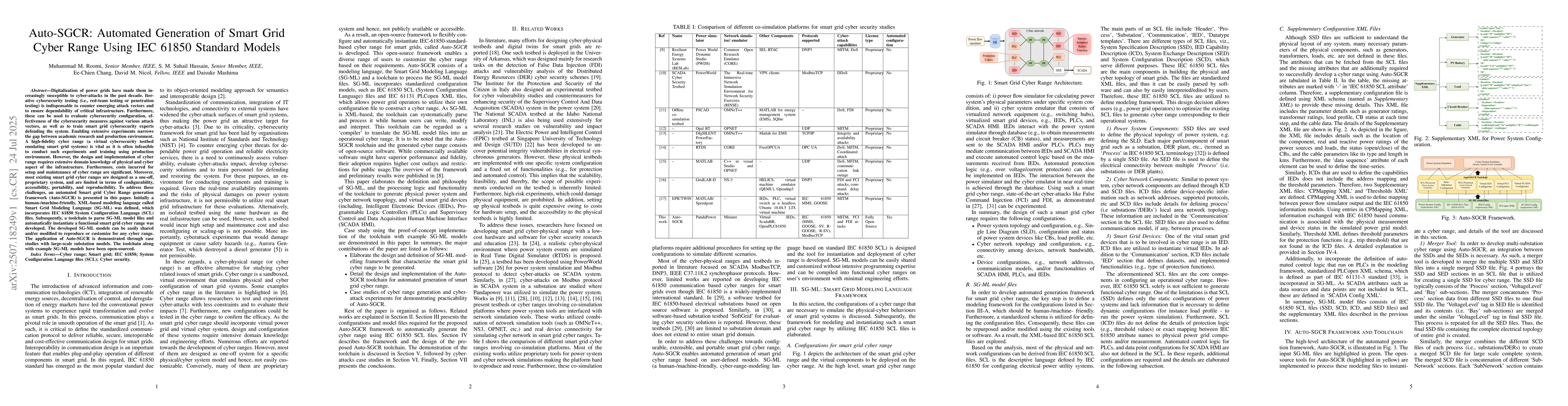 Digitalization of power grids have made them increasingly susceptible to cyber-attacks in the past decade. Iterative cybersecurity testing is indispensable to counter emerging attack vectors and to ensure dependability of critical infrastructure. Furthermore, these can be used to evaluate cybersecurity configuration, effectiveness of the cybersecurity measures against various attack vectors, as well as to train smart grid cybersecurity experts defending the system. Enabling extensive experiments narrows the gap between academic research and production environment. A high-fidelity cyber range is vital as it is often infeasible to conduct such experiments and training using production environment. However, the design and implementation of cyber range requires extensive domain knowledge of physical and cyber aspect of the infrastructure. Furthermore, costs incurred for setup and maintenance of cyber range are significant. Moreover, most existing smart grid cyber ranges are designed as a one-off, proprietary system, and are limited in terms of configurability, accessibility, portability, and reproducibility. To address these challenges, an automated Smart grid Cyber Range generation framework is presented in this paper. Initially a human-/machine-friendly, XML-based modeling language called Smart Grid Modeling Language was defined, which incorporates IEC 61850 System Configuration Language files. Subsequently, a toolchain to parse SG-ML model files and automatically instantiate a functional smart grid cyber range was developed. The developed SG-ML models can be easily shared and/or modified to reproduce or customize for any cyber range. The application of Auto-SGCR is demonstrated through case studies with large-scale substation models. The toolchain along with example SG-ML models have been open-sourced.