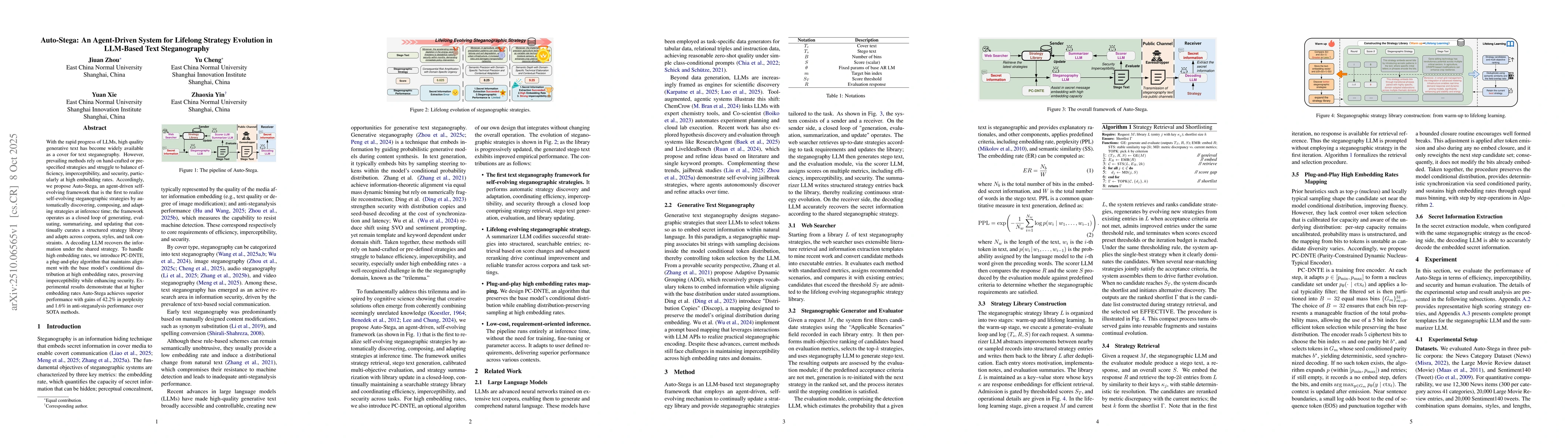The technical contribution lies in the development of a self-evolving steganography framework that combines language model capabilities with strategy-based embedding techniques, enabling iterative refinement of steganographic methods through a structured strategy library and evaluation system.