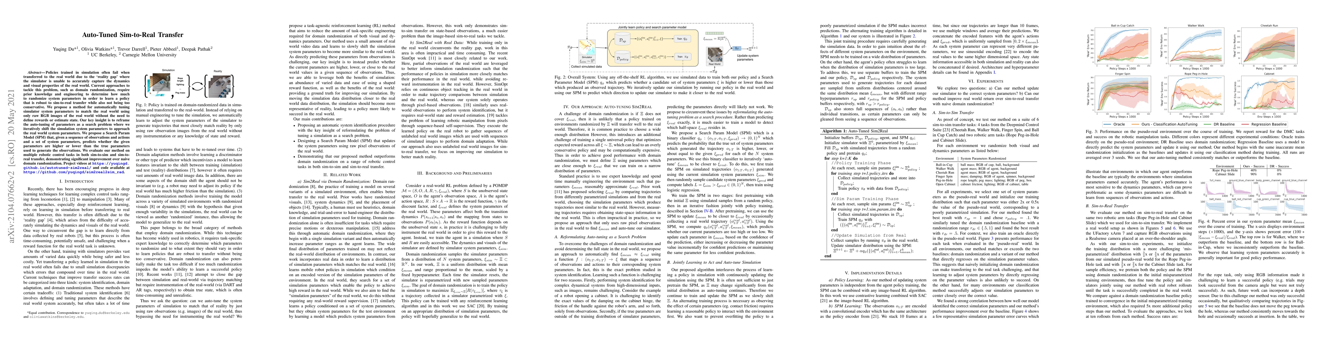 Policies trained in simulation often fail when transferred to the real world due to the `reality gap' where the simulator is unable to accurately capture the dynamics and visual properties of the real world. Current approaches to tackle this problem, such as domain randomization, require prior knowledge and engineering to determine how much to randomize system parameters in order to learn a policy that is robust to sim-to-real transfer while also not being too conservative. We propose a method for automatically tuning simulator system parameters to match the real world using only raw RGB images of the real world without the need to define rewards or estimate state. Our key insight is to reframe the auto-tuning of parameters as a search problem where we iteratively shift the simulation system parameters to approach the real-world system parameters. We propose a Search Param Model (SPM) that, given a sequence of observations and actions and a set of system parameters, predicts whether the given parameters are higher or lower than the true parameters used to generate the observations. We evaluate our method on multiple robotic control tasks in both sim-to-sim and sim-to-real transfer, demonstrating significant improvement over naive domain randomization. Project videos and code at https://yuqingd.github.io/autotuned-sim2real/