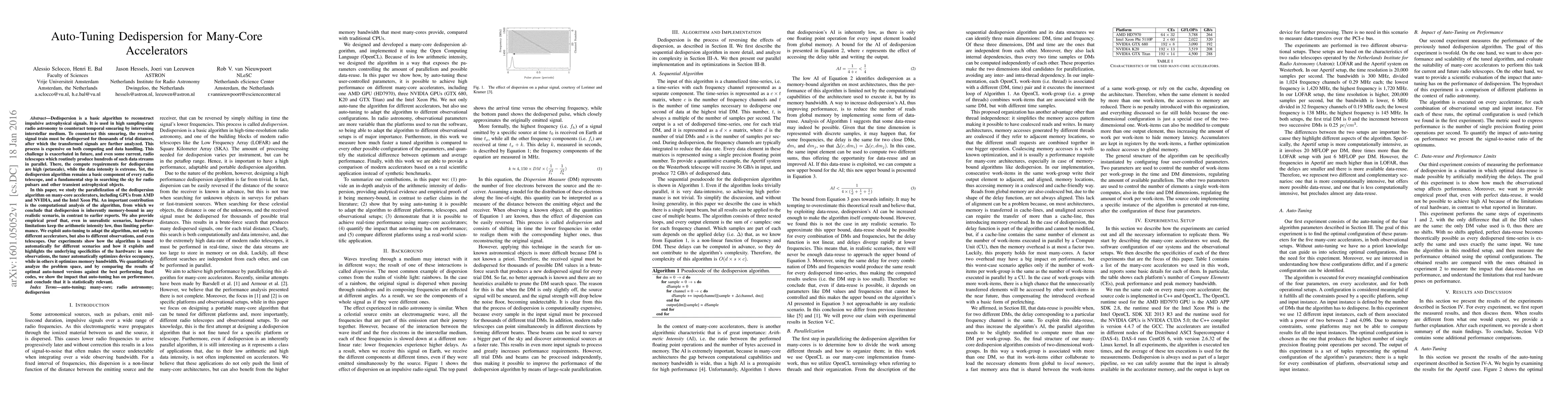 This paper investigates the parallelization of the dedispersion algorithm on many-core accelerators, revealing that it is inherently memory-bound. The authors employ auto-tuning to optimize the algorithm for various accelerators and observations, demonstrating significant performance improvements over fixed codes.