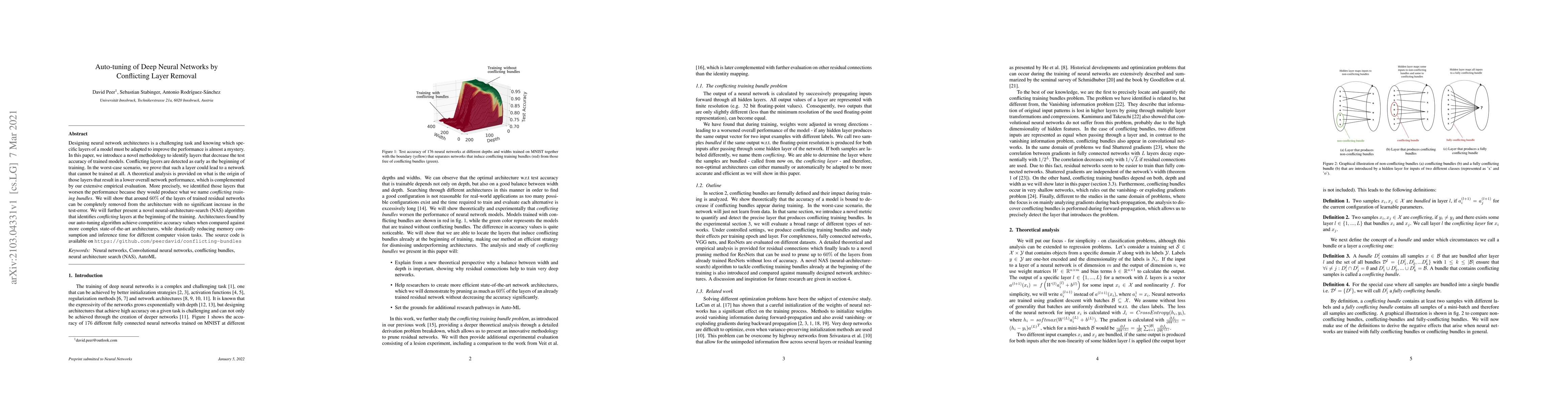 Designing neural network architectures is a challenging task and knowing which specific layers of a model must be adapted to improve the performance is almost a mystery. In this paper, we introduce a novel methodology to identify layers that decrease the test accuracy of trained models. Conflicting layers are detected as early as the beginning of training. In the worst-case scenario, we prove that such a layer could lead to a network that cannot be trained at all. A theoretical analysis is provided on what is the origin of those layers that result in a lower overall network performance, which is complemented by our extensive empirical evaluation. More precisely, we identified those layers that worsen the performance because they would produce what we name conflicting training bundles. We will show that around 60% of the layers of trained residual networks can be completely removed from the architecture with no significant increase in the test-error. We will further present a novel neural-architecture-search (NAS) algorithm that identifies conflicting layers at the beginning of the training. Architectures found by our auto-tuning algorithm achieve competitive accuracy values when compared against more complex state-of-the-art architectures, while drastically reducing memory consumption and inference time for different computer vision tasks. The source code is available on https://github.com/peerdavid/conflicting-bundles