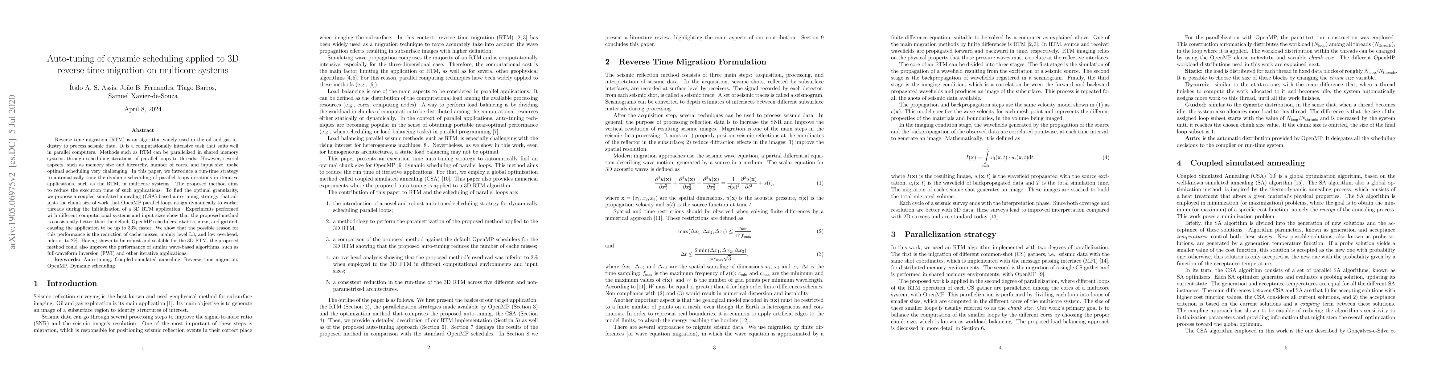 The paper presents a novel CSA-based auto-tuning strategy for dynamic scheduling of OpenMP parallel loops, which effectively reduces execution time and cache misses in 3D RTM on multicore systems.