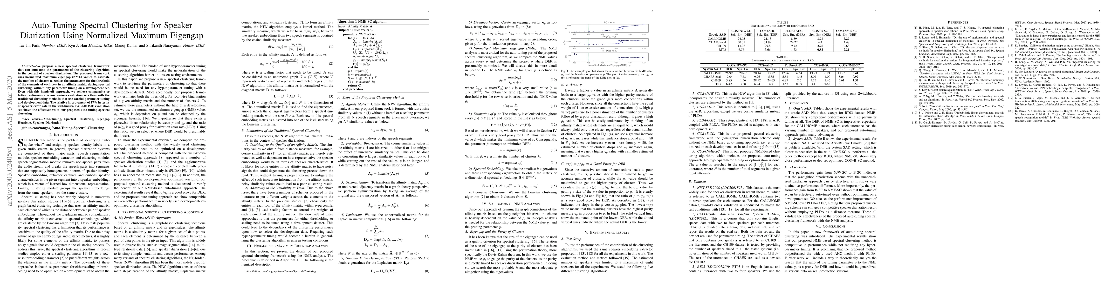 This paper introduces an auto-tuning spectral clustering framework for speaker diarization that uses normalized maximum eigengap values to determine cluster numbers and thresholds, achieving comparable or superior performance without manual parameter tuning, demonstrated by a 17% relative improvement in speaker error rate on the CALLHOME dataset.