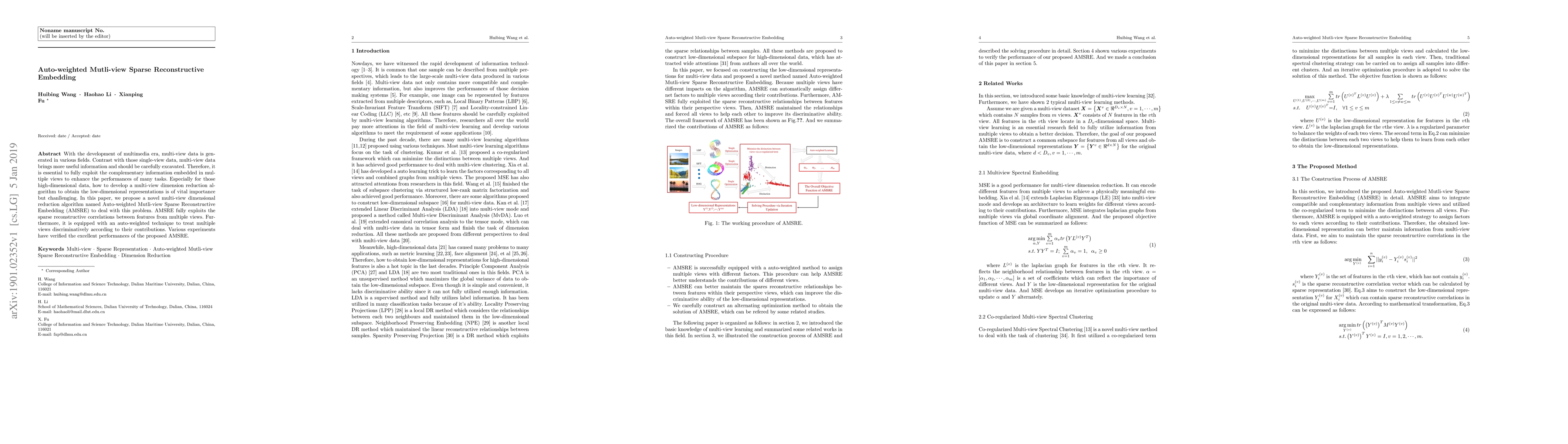 This paper proposes a novel multi-view dimensional reduction algorithm called Auto-weighted Mutli-view Sparse Reconstructive Embedding (AMSRE) to enhance the performance of tasks involving high-dimensional data. AMSRE leverages sparse reconstructive correlations and an auto-weighted technique to effectively exploit complementary information from multiple views.