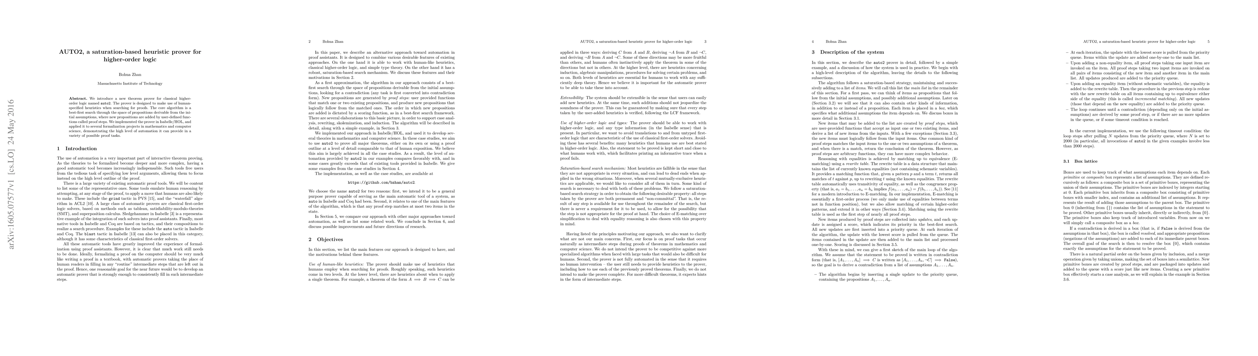 The AUTO2 theorem prover leverages user-defined heuristics for automating proof search in classical higher-order logic, implemented in Isabelle/HOL, and successfully enhances automation in various mathematical and computer science formalization projects. Its core is a best-first search algorithm that incorporates user-specified proof steps to generate new propositions.