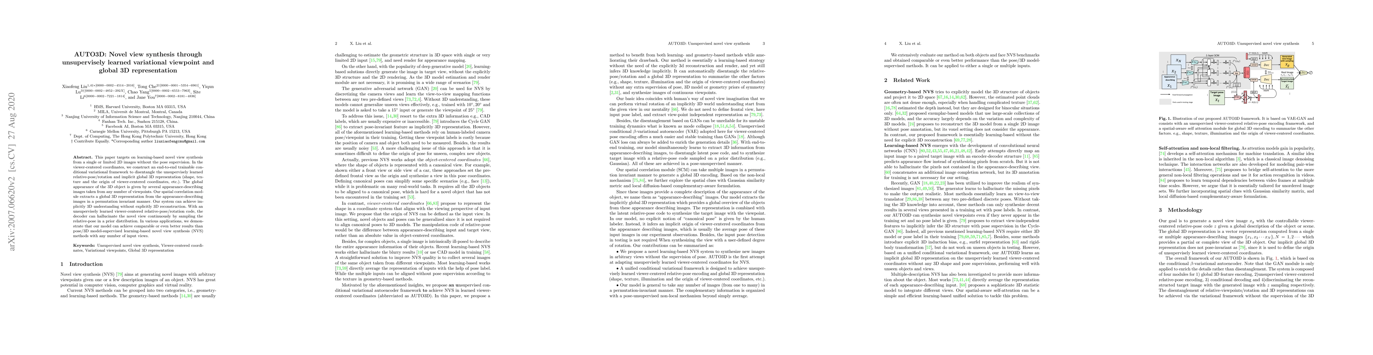 This paper presents AUTO3D, a method for unsupervised novel view synthesis from single or limited 2D images, using a conditional variational framework to learn relative pose and global 3D representation without pose supervision. The model achieves comparable or superior results to supervised methods by implicitly understanding 3D objects through spatial correlation and viewer-centered relative pose.