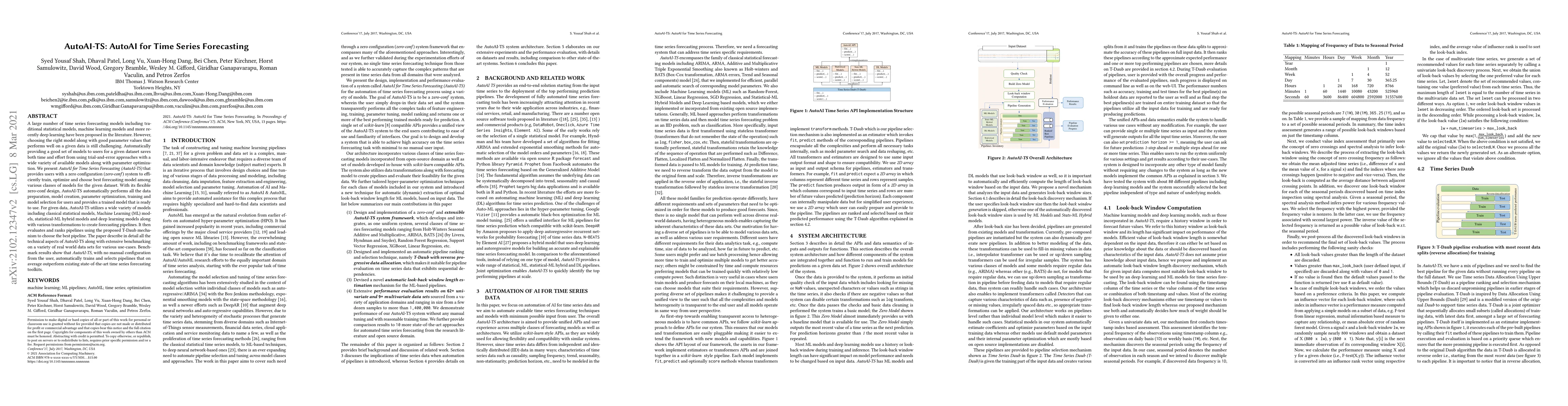 AutoAI-TS automates time series forecasting by providing a zero-configuration system that efficiently trains, optimizes, and selects the best model from various classes, including statistical, machine learning, and deep learning models, without manual intervention. Benchmarking results show it outperforms existing tools on real-world datasets.